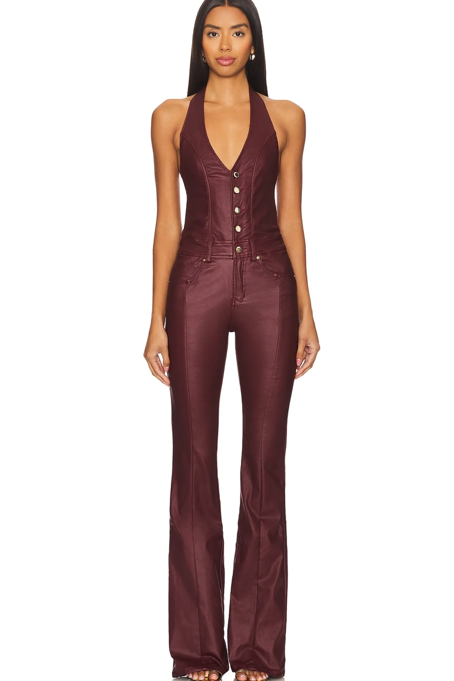 76% viscose 21% polyamide 3% elastane.Made in China.Machine wash.Zip fly with button closure.Halterneck styling with tie detail.Front slip pockets.Back cut-out with adjustable strap Midweight coated denim fabric