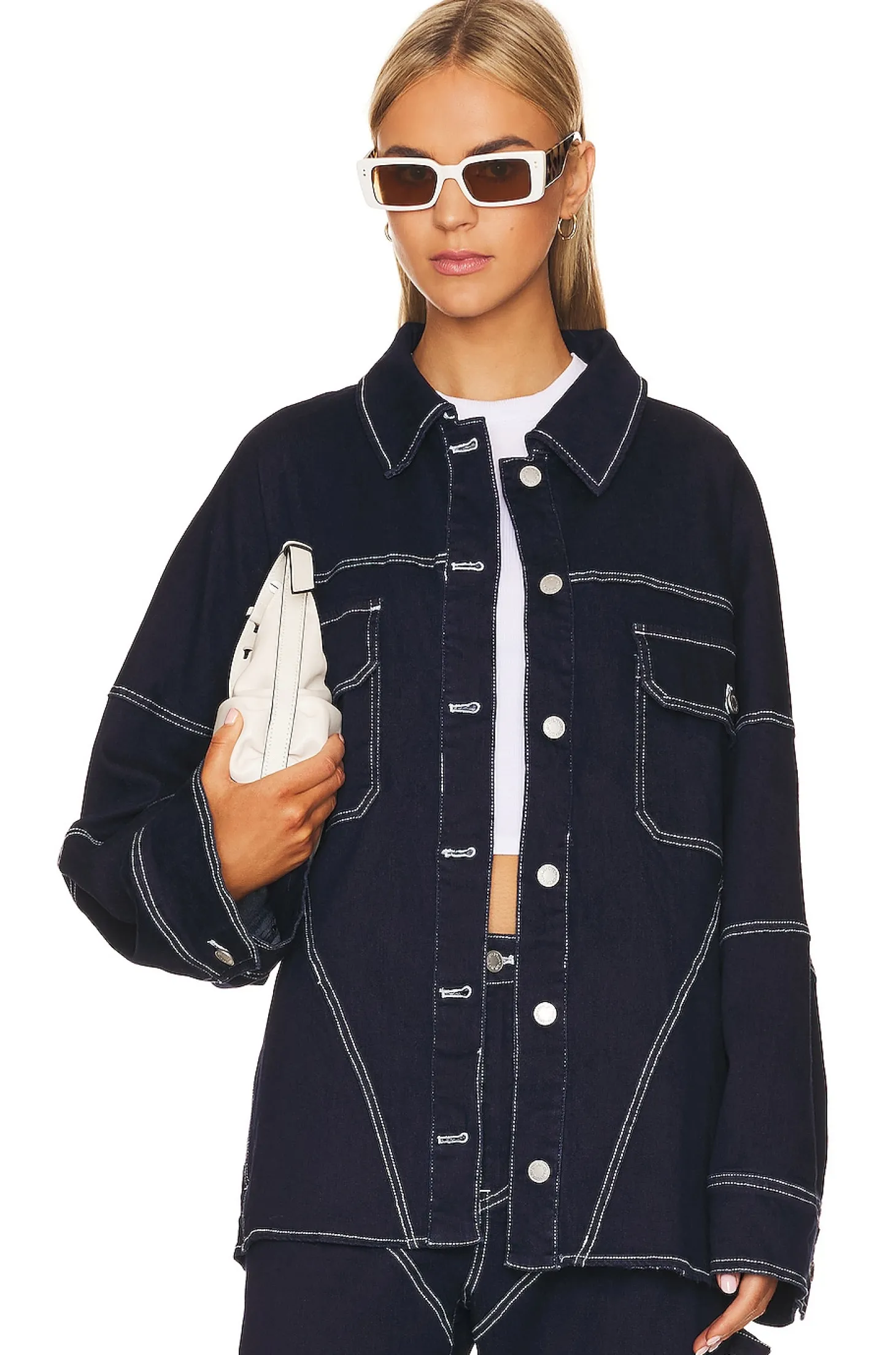 80% cotton 18% viscose 2% elastane.Made in China.Machine wash.Front button closure.Breast flap pockets with button detail.Contrast stitching.Item not sold as set.BY.DYLN's Cyrus Jacket provides an oversized fit for an effortlessly casual look. This style is a part of a set and pairs well with the Cyrus Jeans.