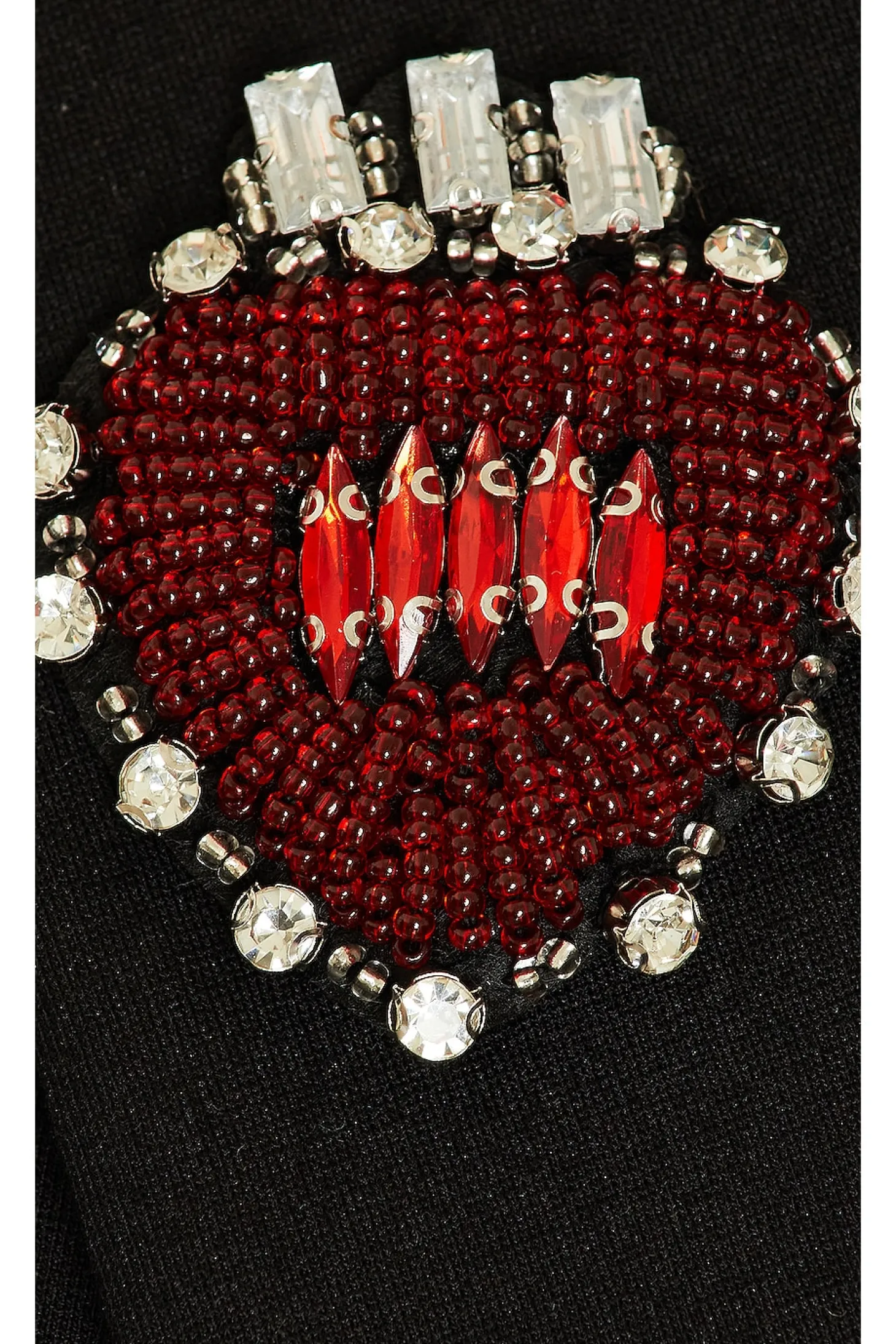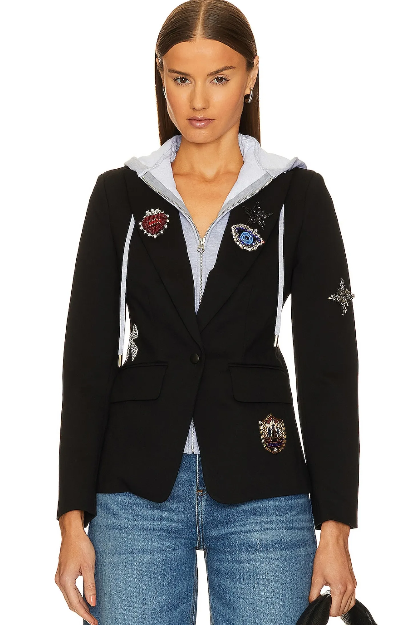 Self: 65% rayon 30% nylon 5% polyester Lining: 100% cotton Contrast Fabric: 97% polyester 3% spandex.Made in China.Dry clean recommended.Singular front button closure.Front faux welt pockets.Layered styling with attached hoodie.Sequin and bead embellished patches throughout