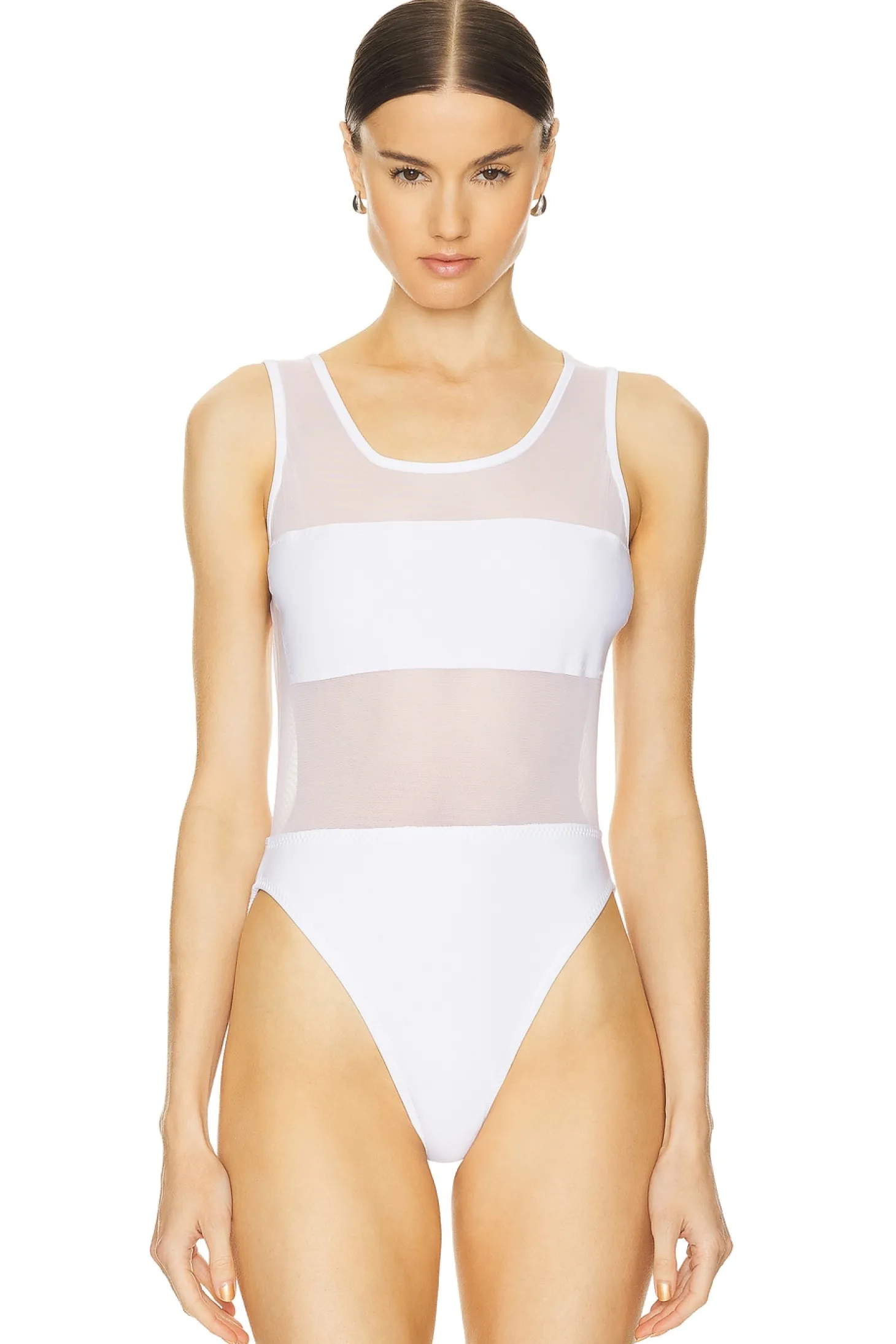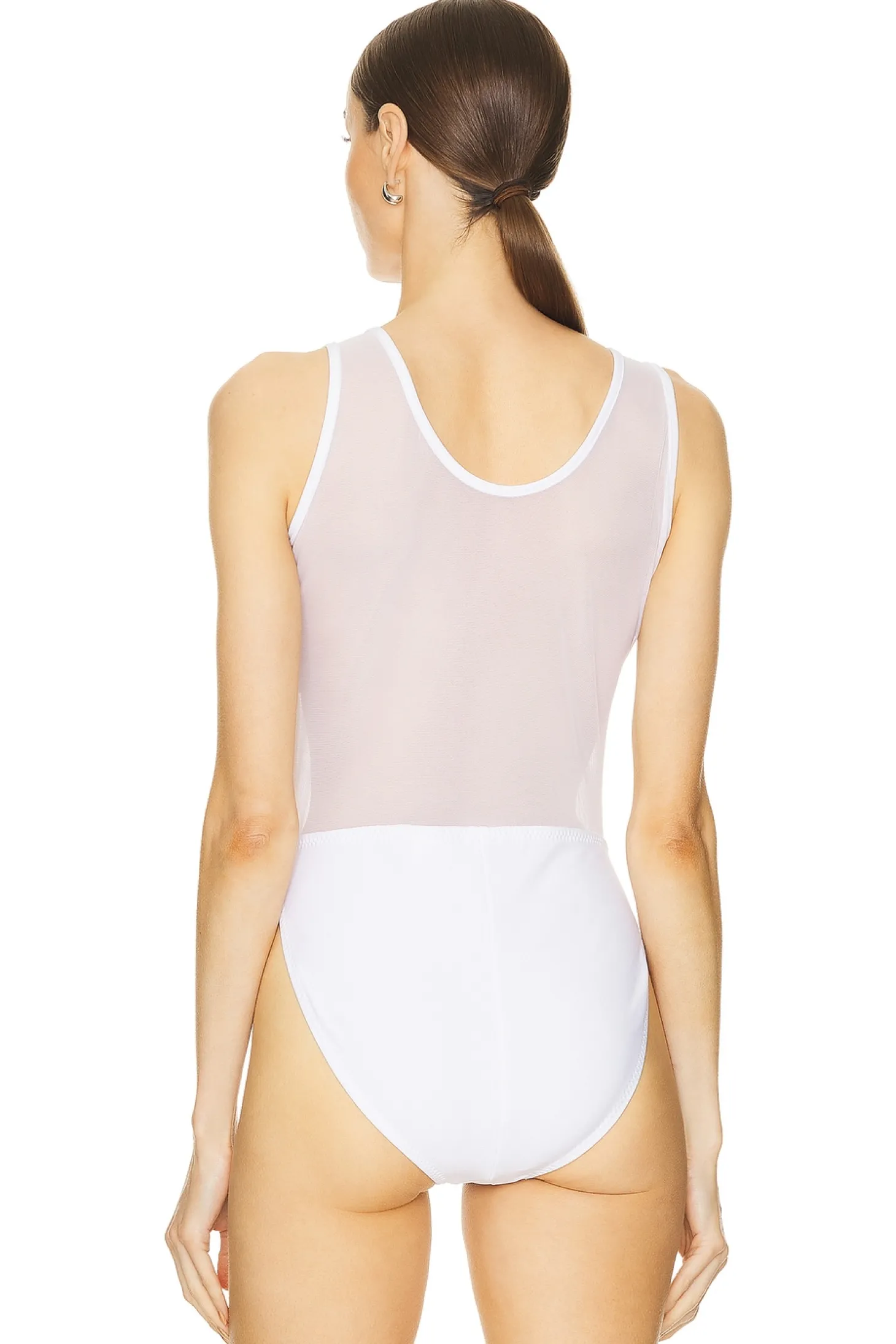 Self: 93% polyester 7% spandex Trim: 82% nylon 18% spandex.Made in China.Machine wash.Gusset snap button closure.Lightweight jersey fabric with mesh paneling.Style runs large, size down.style runs large, size down