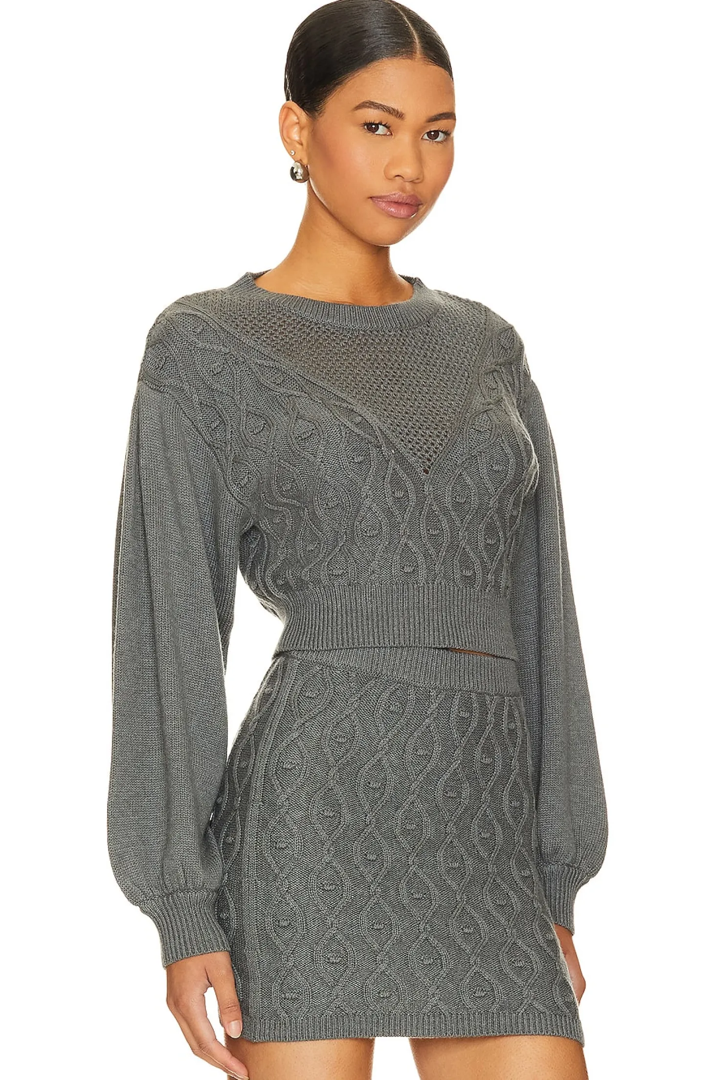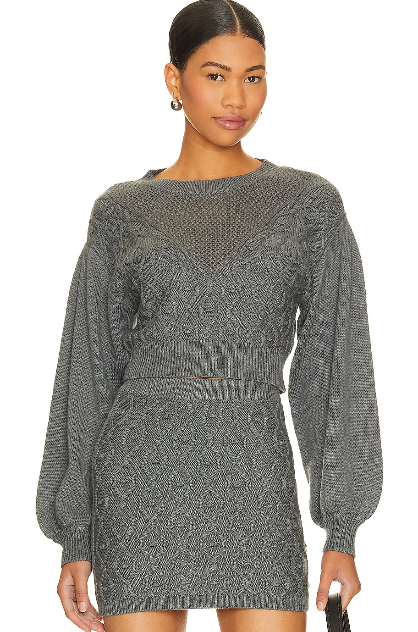 60% cotton 30% nylon 10% wool.Made in China.Dry clean only.Puff sleeve with ribbed cuff.Knit fabric with intricate detail.Item not sold as set