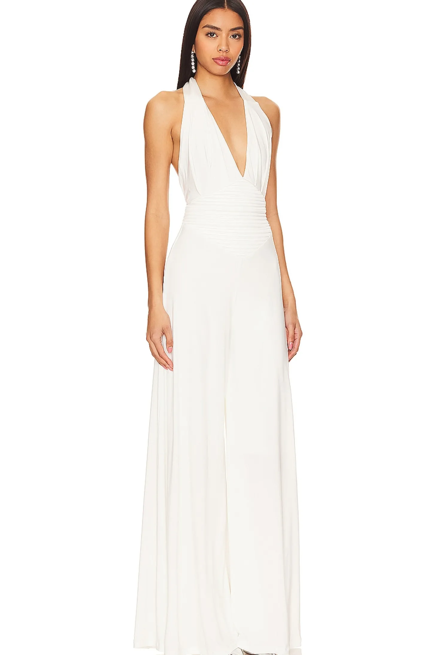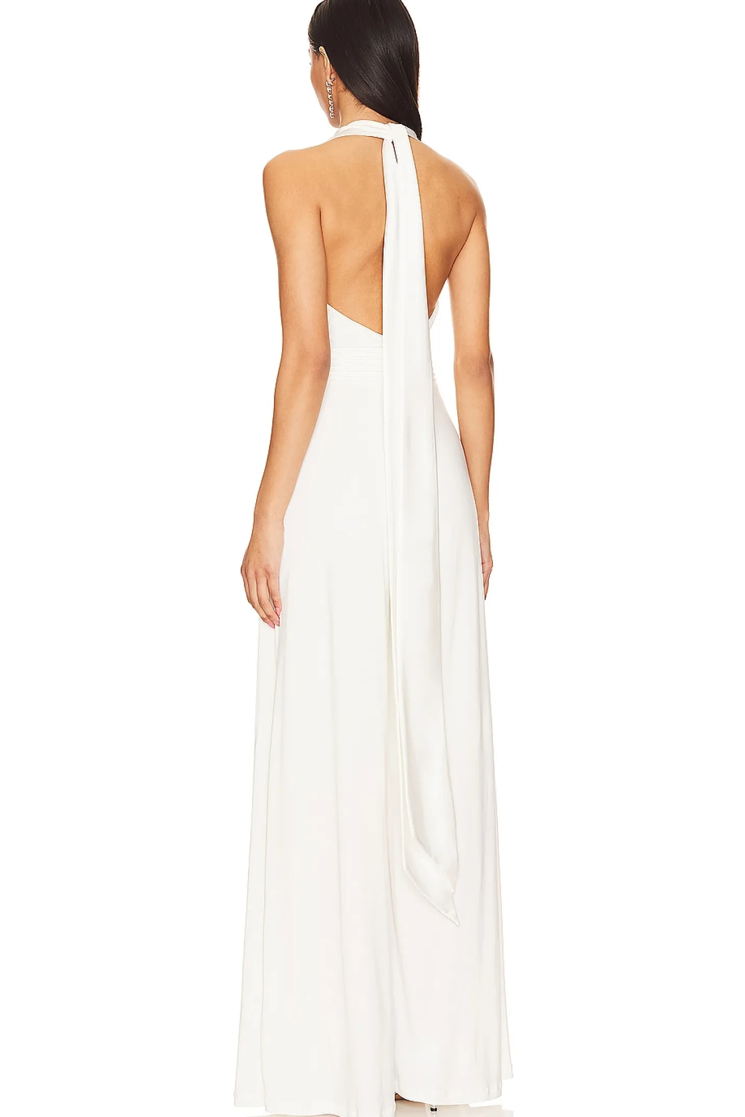 Polyester blend.Imported.Dry clean recommended.Halterneck tie closure Exposed back zipper closure.Ribbed satin bodice panel.Heavyweight jersey fabric
