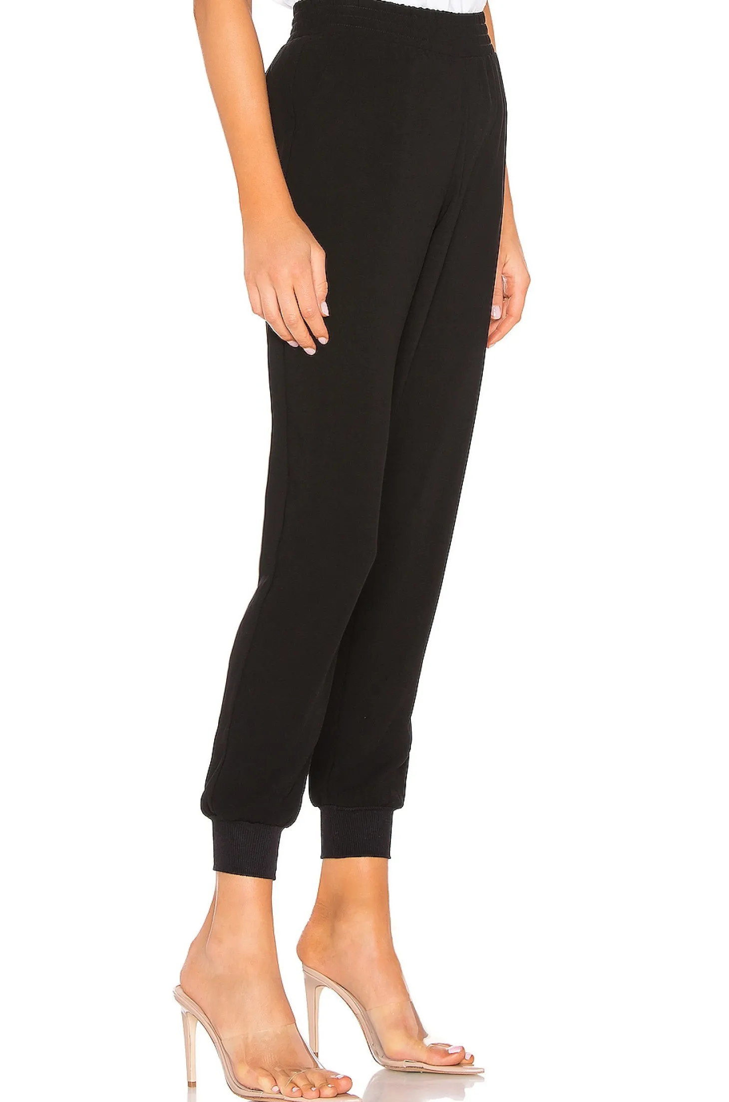 100% recycled polyester.Made in China.Machine wash.Elasticized waist.Side slant pockets.Back welt pockets.Midweight crepe fabric with ribbed knit cuffs.15" at the knee narrows to 8" at the leg opening.These elastic waist joggers provide an easy, everyday fit. Made from crepe fabric, they can be easily dressed up or down.