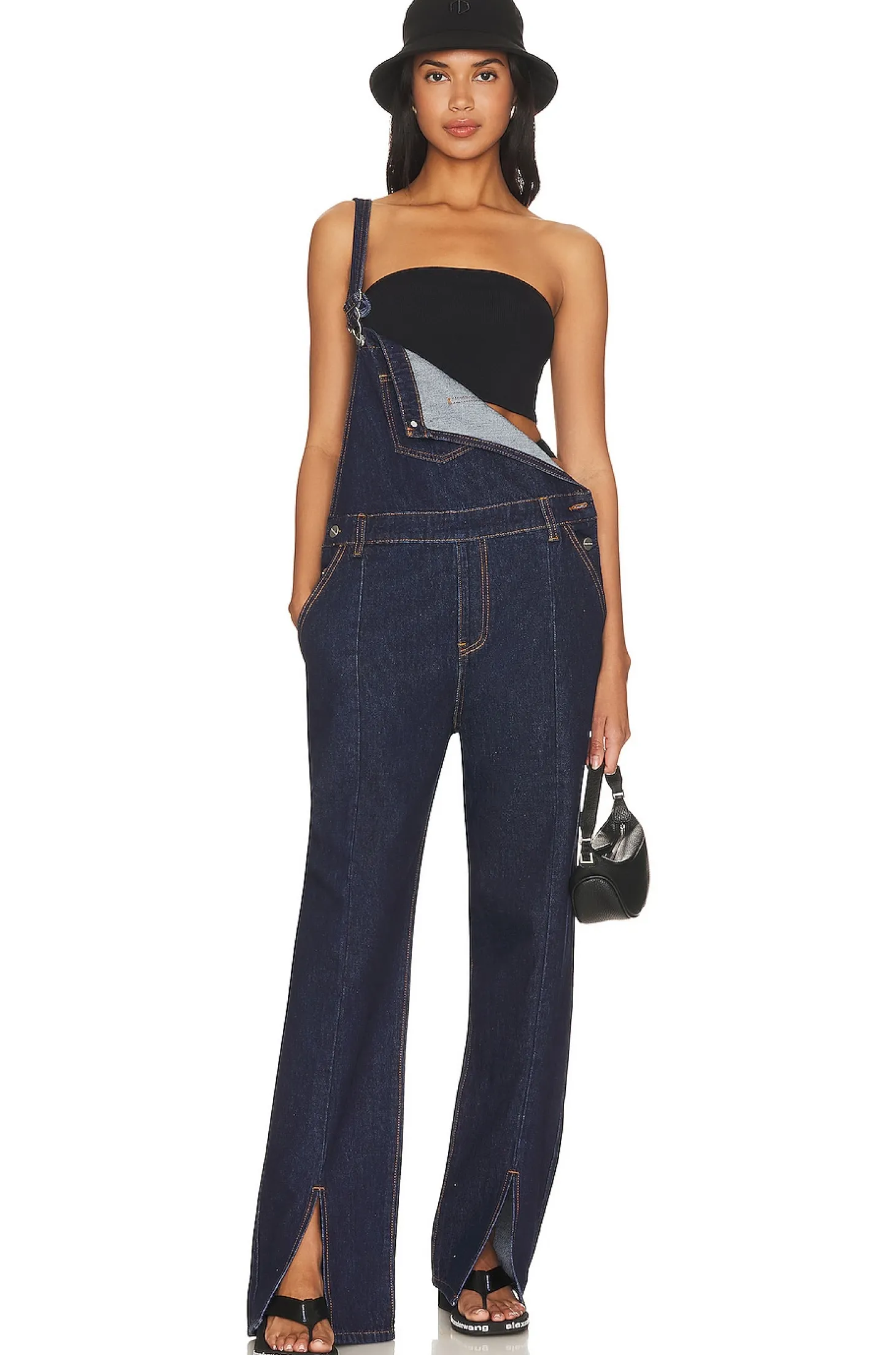 98% cotton 2% elastane.Made in China.Hand wash.Adjustable shoulder straps with buckle closure.5-pocket design.Hip button details.Midweight denim fabric with split cuffs