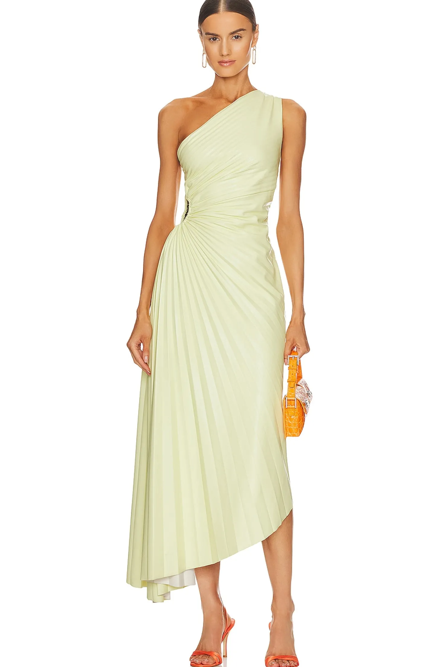 Self: 95% viscose 5% elastane Lining: 82% polyamide 18% elastane.Made in China.Dry clean only.Unlined.Hidden side zipper closure.One shoulder styling Side O-cut-out.Midweight pleated leather fabric