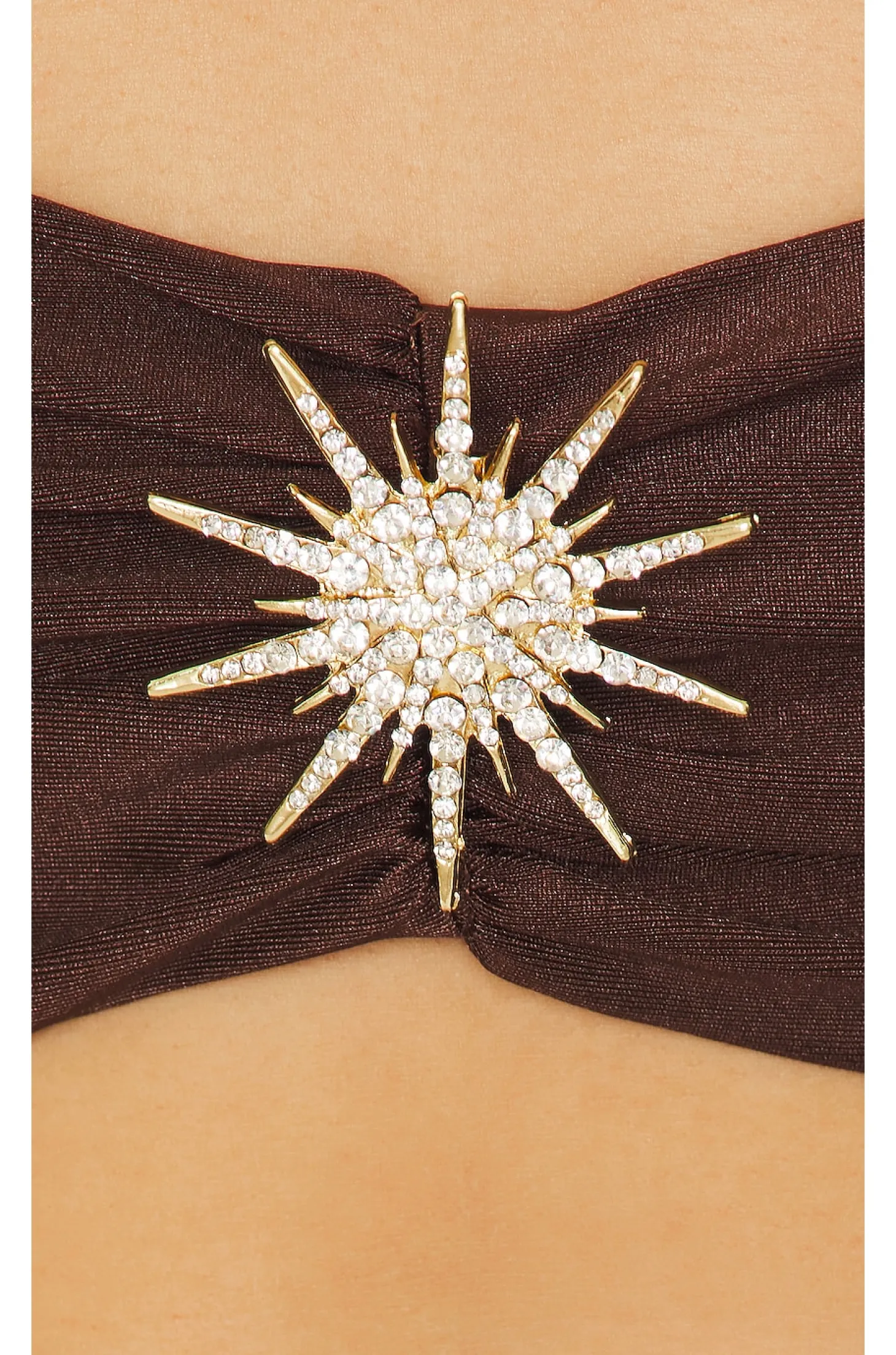 Self: 47% nylon 45% polyester 8% spandex Lining: 90% nylon 10% spandex.Made in U.S.A..Dry clean only.Hidden back zipper closure.Non-slip silicone grip lining at neckline.Front cut-out with crystal embellished starburst charms.Stretch jersey fabric with sheen finish
