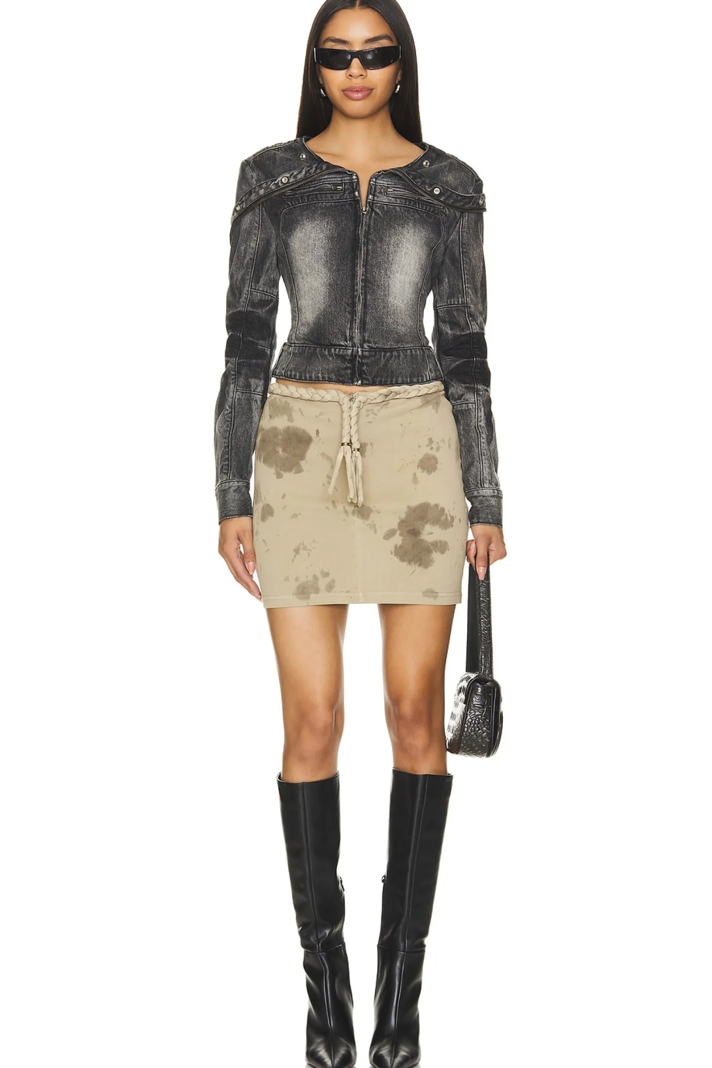 90% cotton 10% polyester.Made in China.Machine wash.Front exposed zipper closure.Attached shoulder drape detail