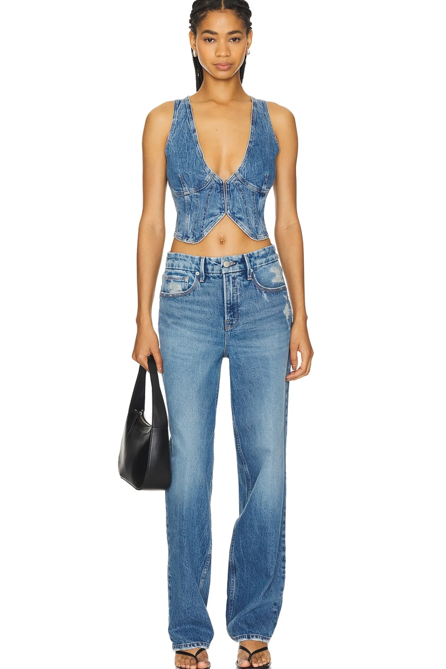 79% cotton 20% preconsumer cotton 1% elastane.Made in Turkey.Machine wash.Front hook and eye closure.Contour bust with plunging neckline.Midweight denim fabric