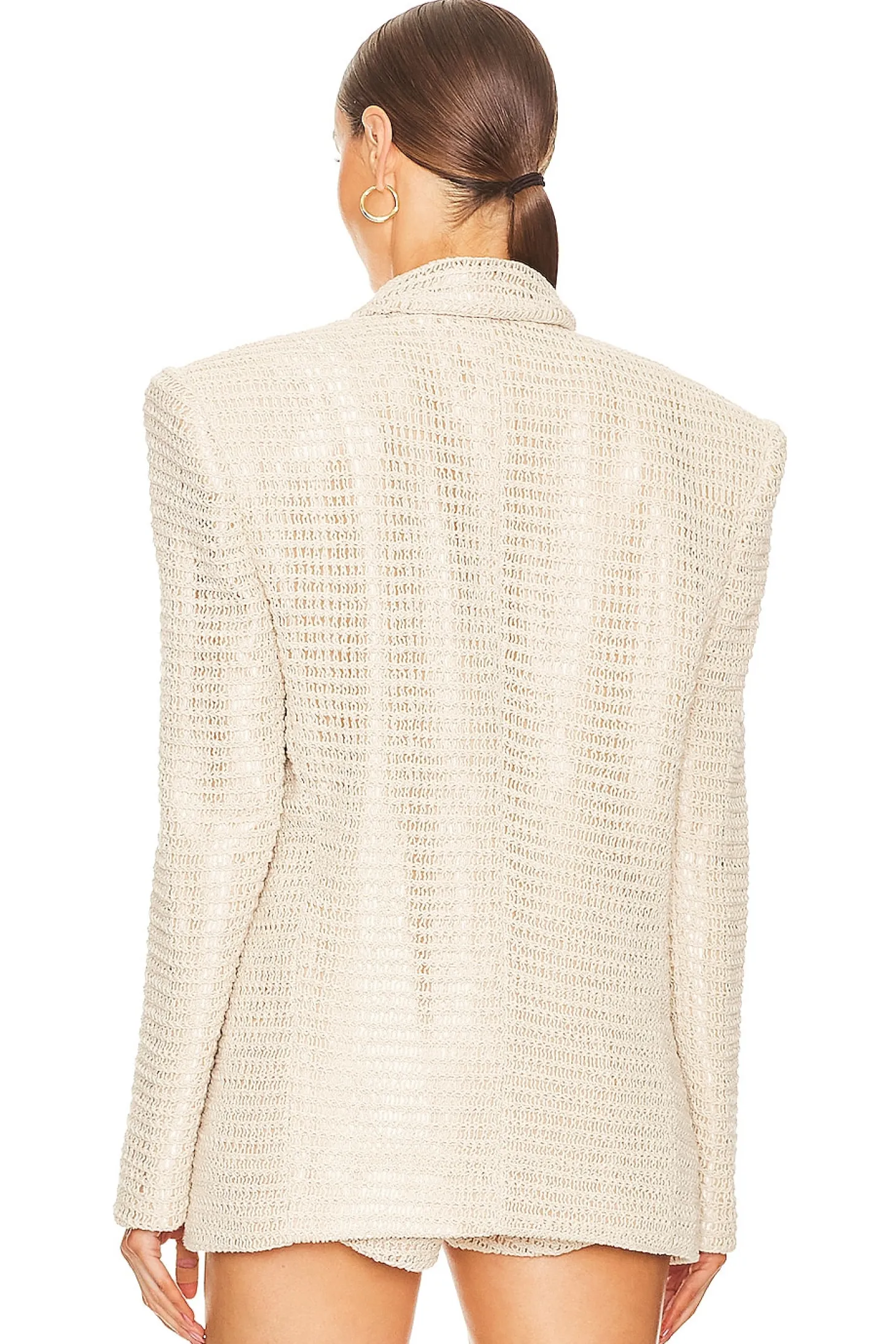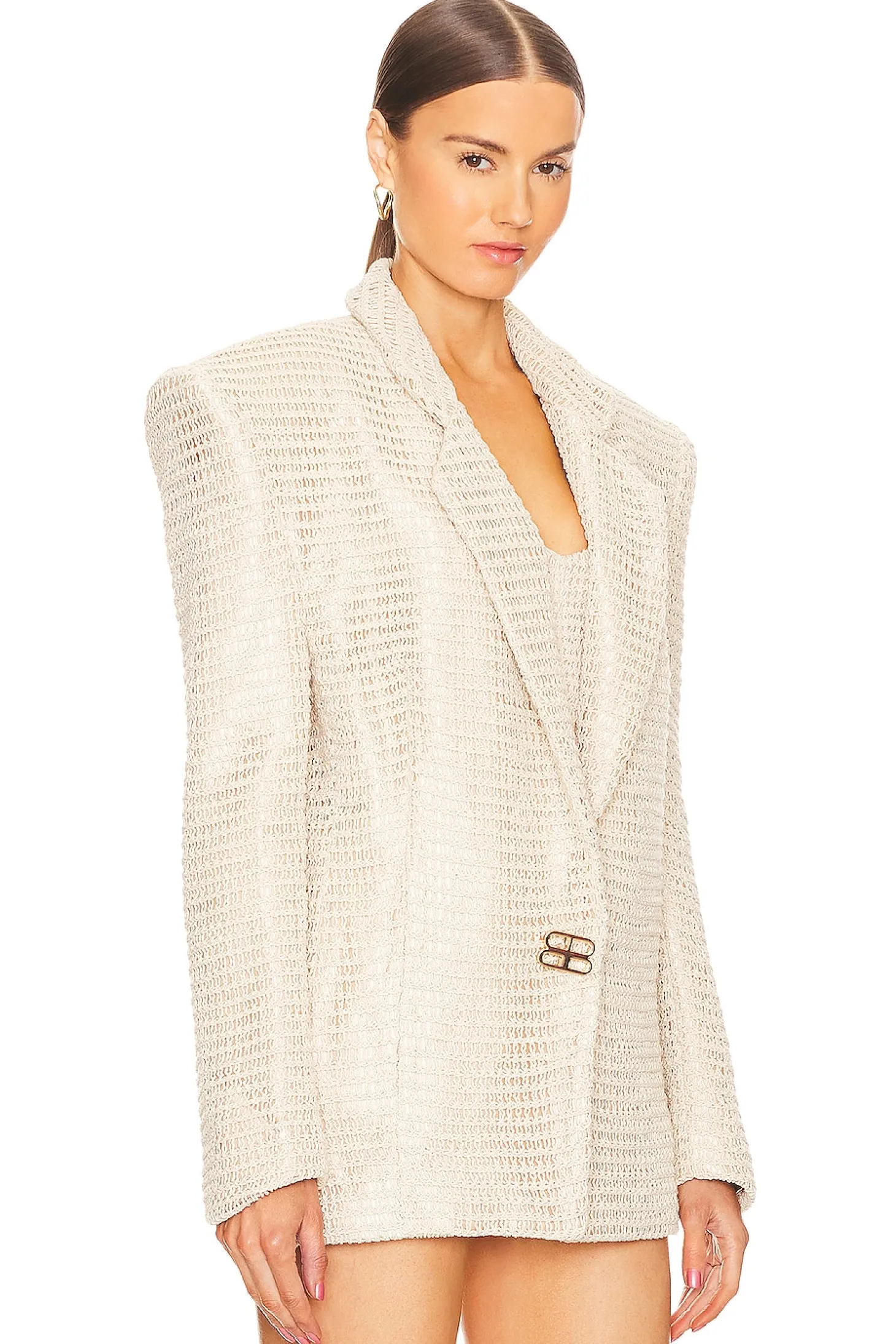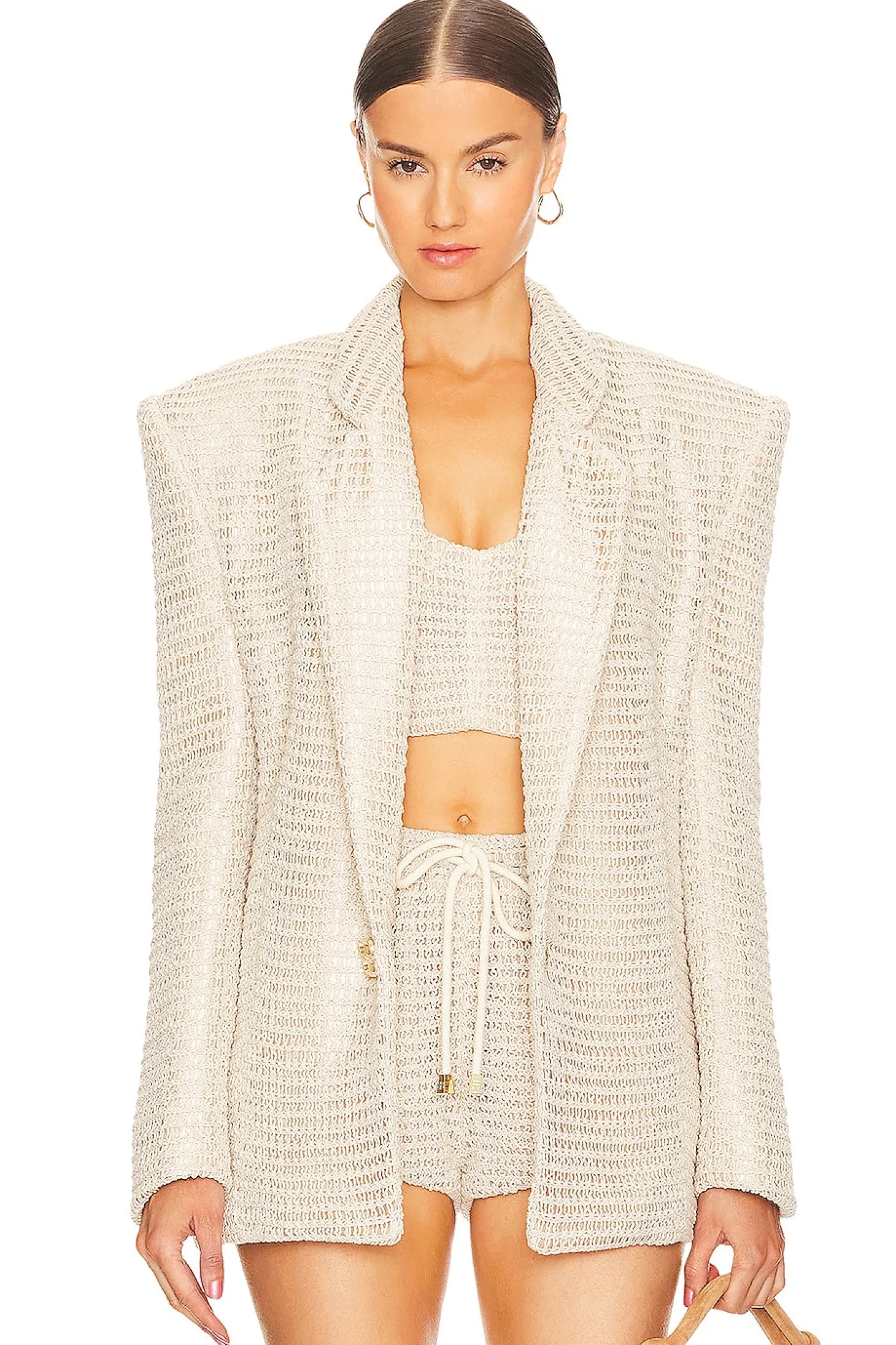 Cotton blend.Imported.Dry clean recommended.Singular front snap button closure.Padded shoulders.Crochet fabric overlay.Item not sold as a set