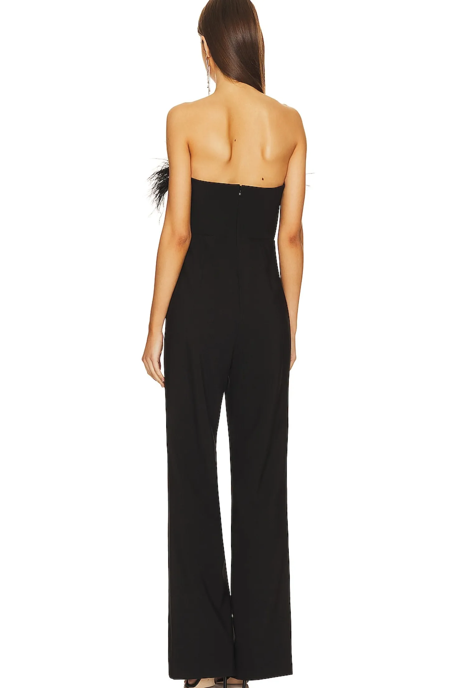 Polyester blend.Imported.Dry clean recommended.Hidden back zipper closure.Feather-trimmed neckline.Neckline to hem measures approx 51" in length 20" at the knee breaks to 22" at the leg opening