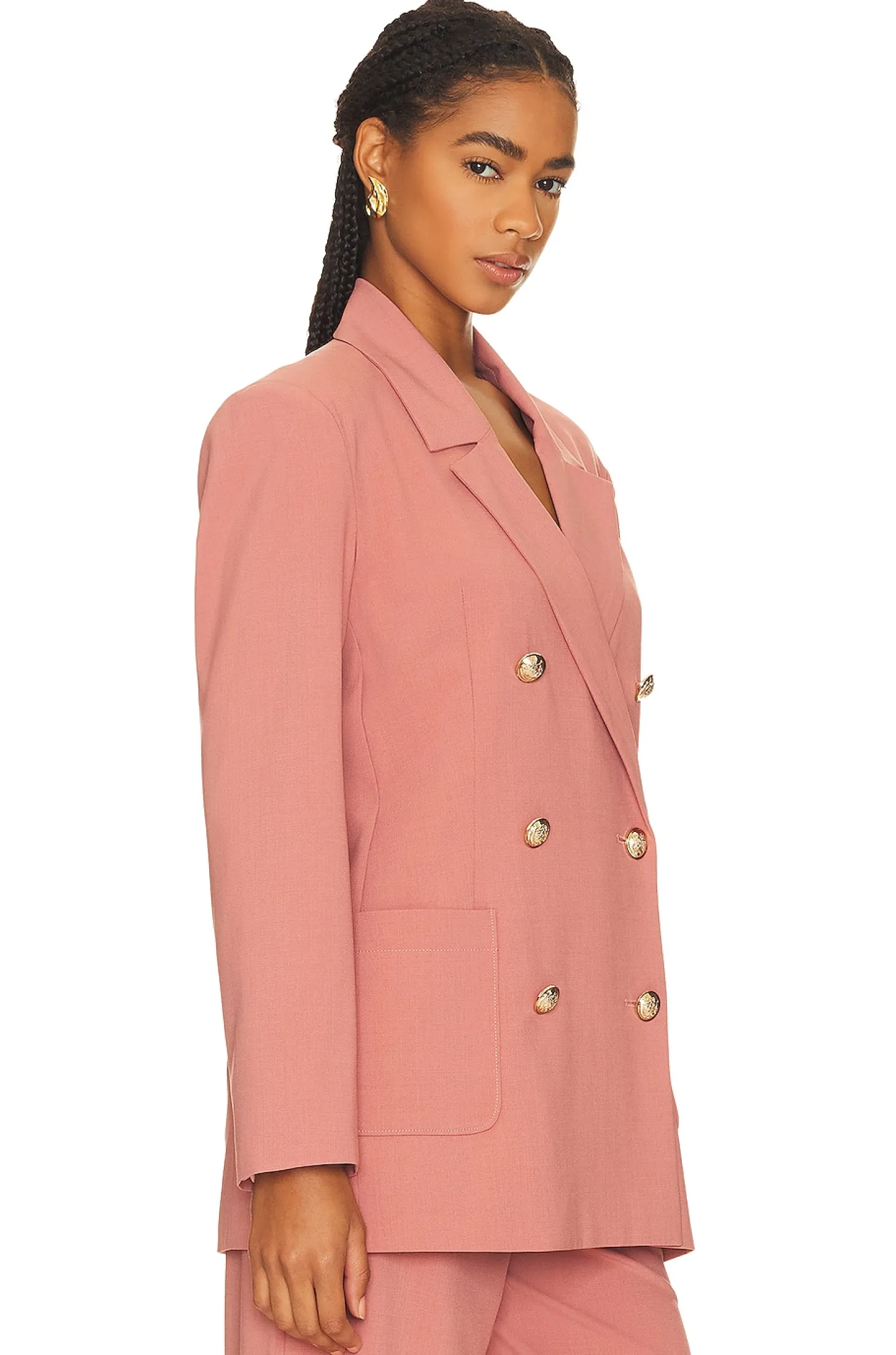 97% polyester 3% elastane.Made in China.Hand wash.Front gold-tone button closure.Padded shoulders.Side slip pockets.Midweight crepe fabric with back vent.Item not sold as set