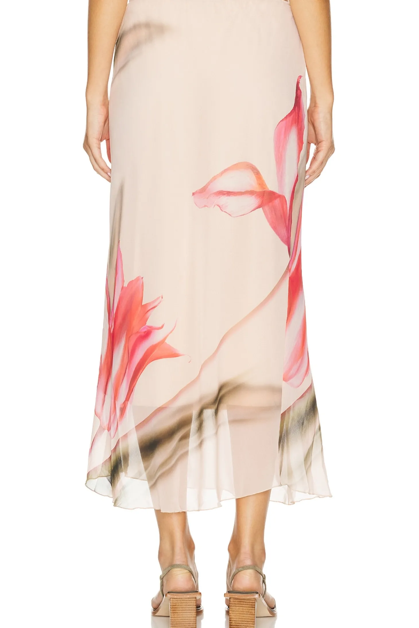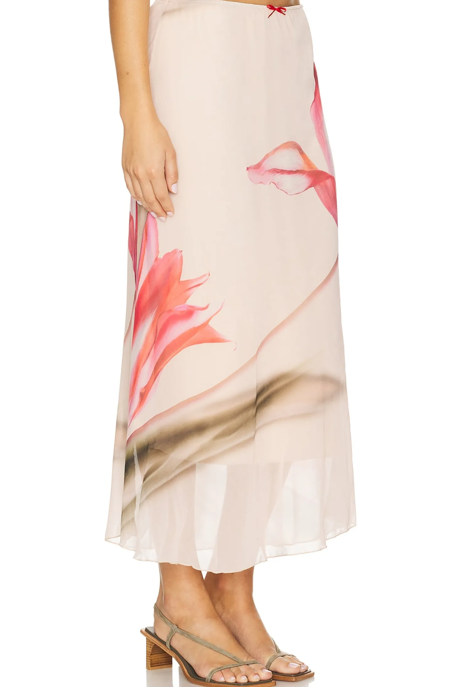 100% polyester.Made in France.Dry clean only.Partially lined.Elastic waistband with red satin bow accent.Item not sold as set.Chiffon fabric.Skirt measures approx 36" in length
