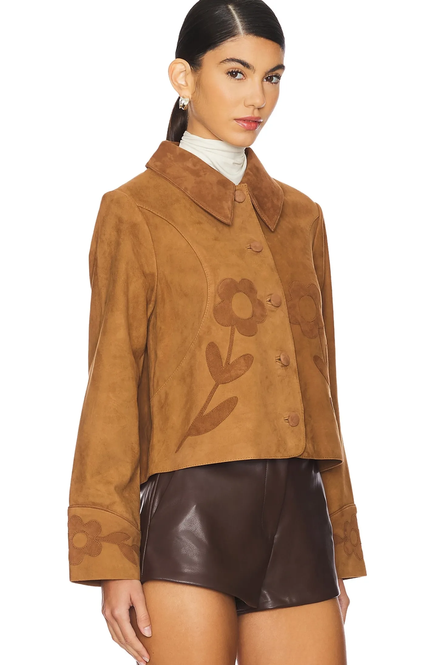 Self: 100% suede leather Lining: 100% polyester.Made in India.Dry clean only.Front button closure.Flower detailing on body and cuffs.Midweight suede leather fabric