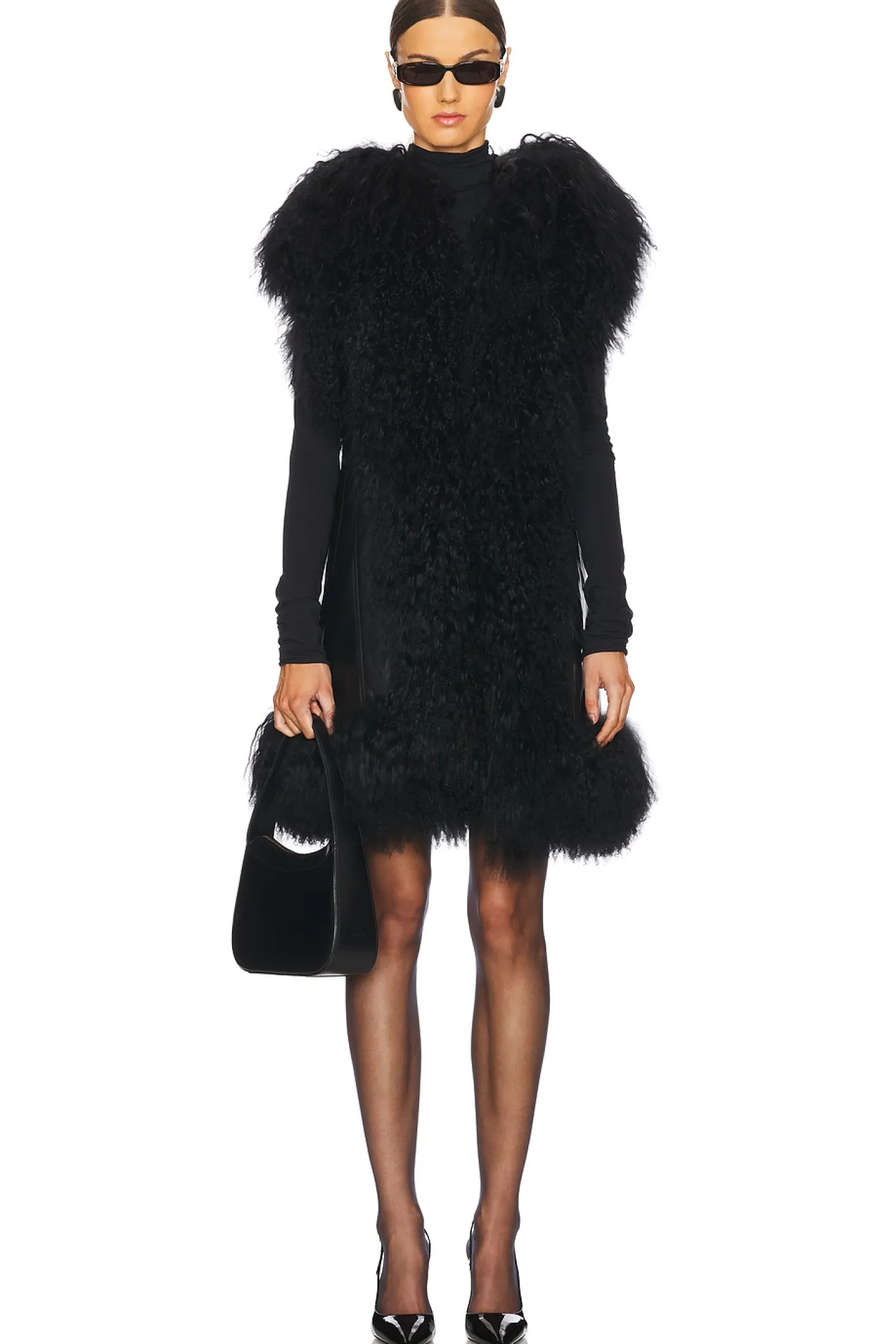 Self 1: 100% dyed shearling fur Self 2: 100% sheep leather Lining: 100% polyester.Made in China Fur Origin: China.Dry clean only.Front Snap Button Closure.Side seam pockets.Cape design with detachable shearling collar.Silver buttons