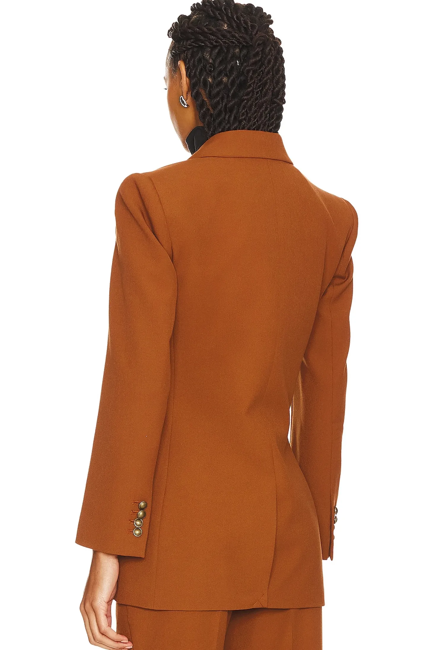 Self: 68% polyester 29% viscose 3% elastane Lining: 50% polyester 50% viscose.Made in Morocco.Dry clean only.Dual-breasted front button closure.Side flap pockets.Button cuffs.Twill suiting fabric