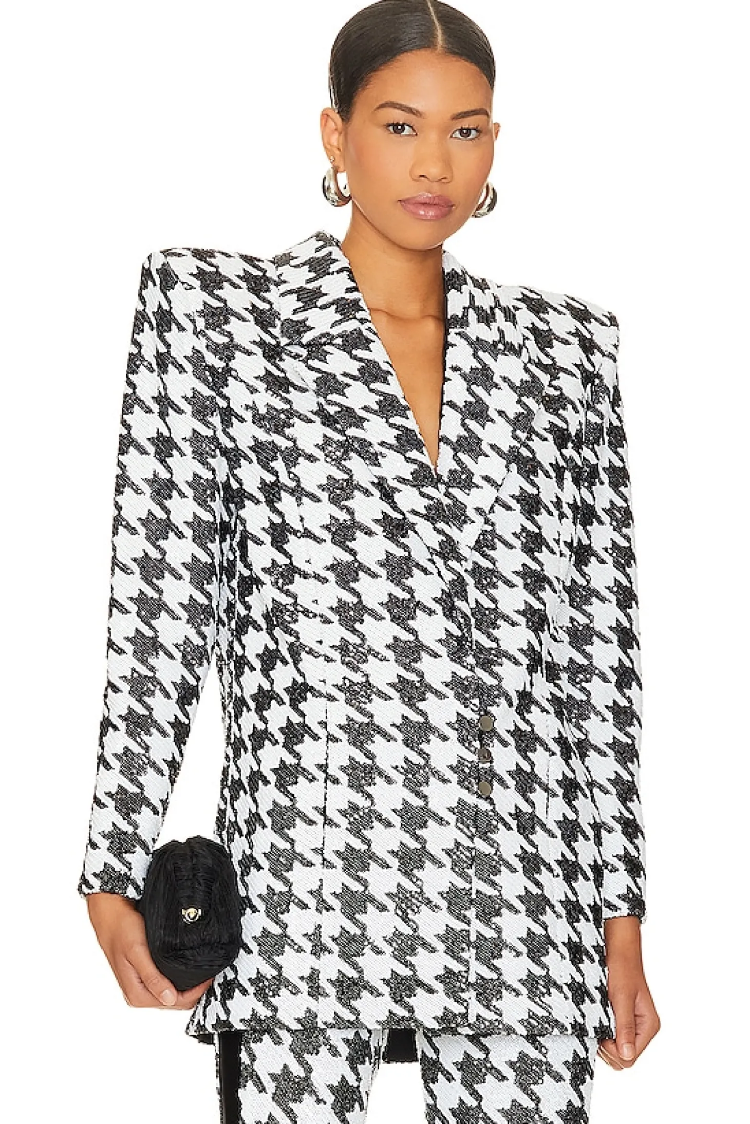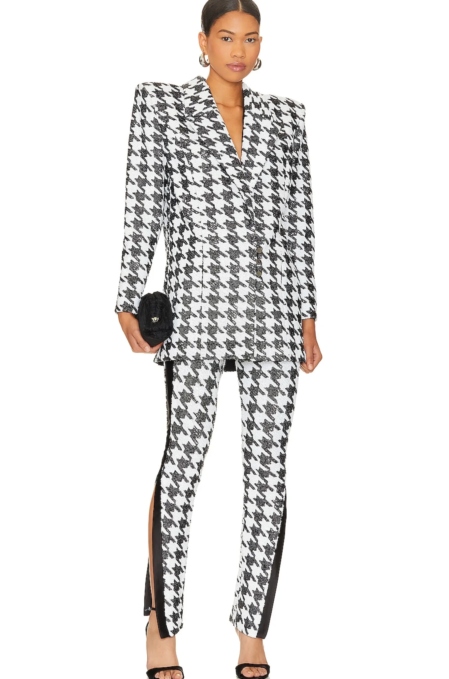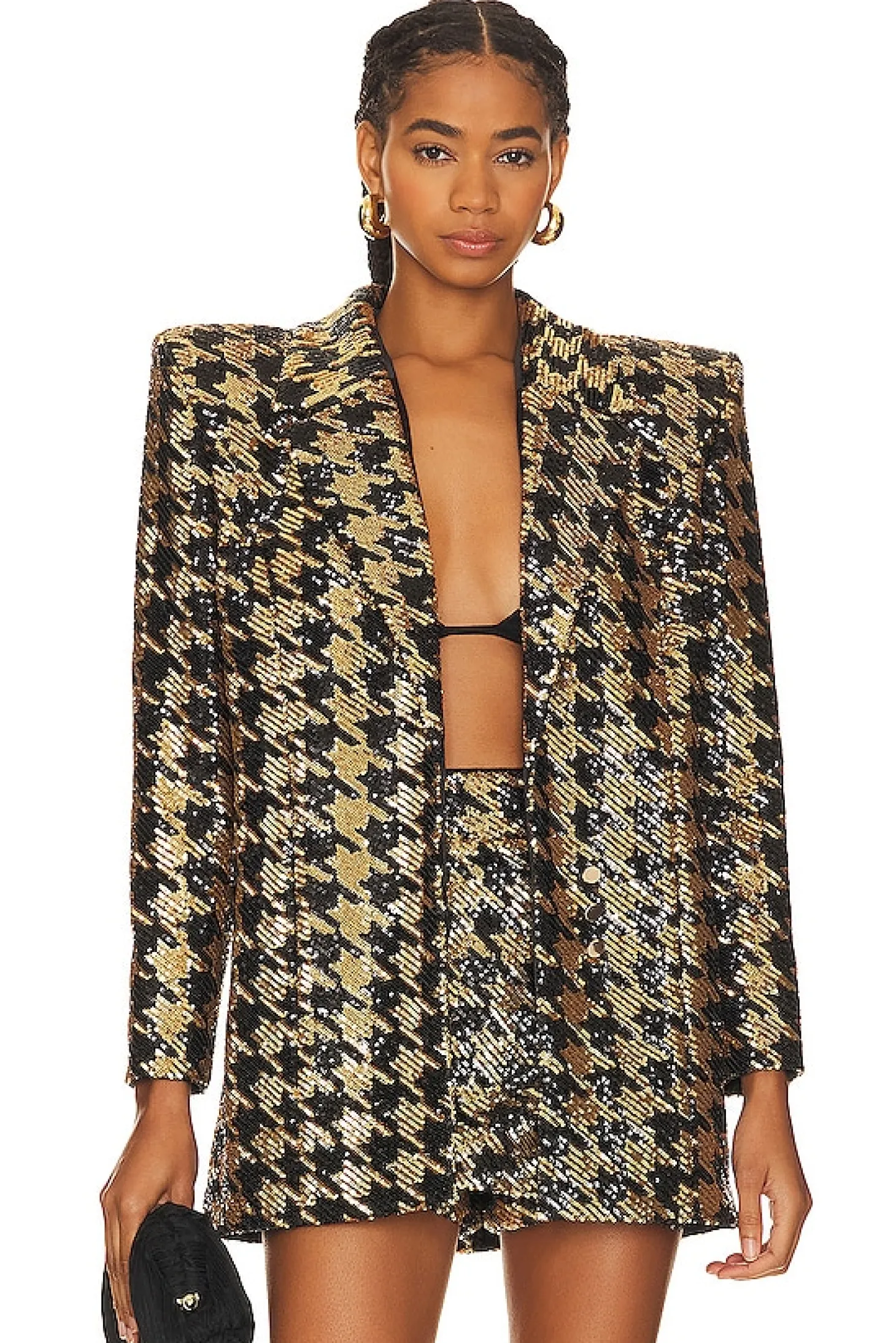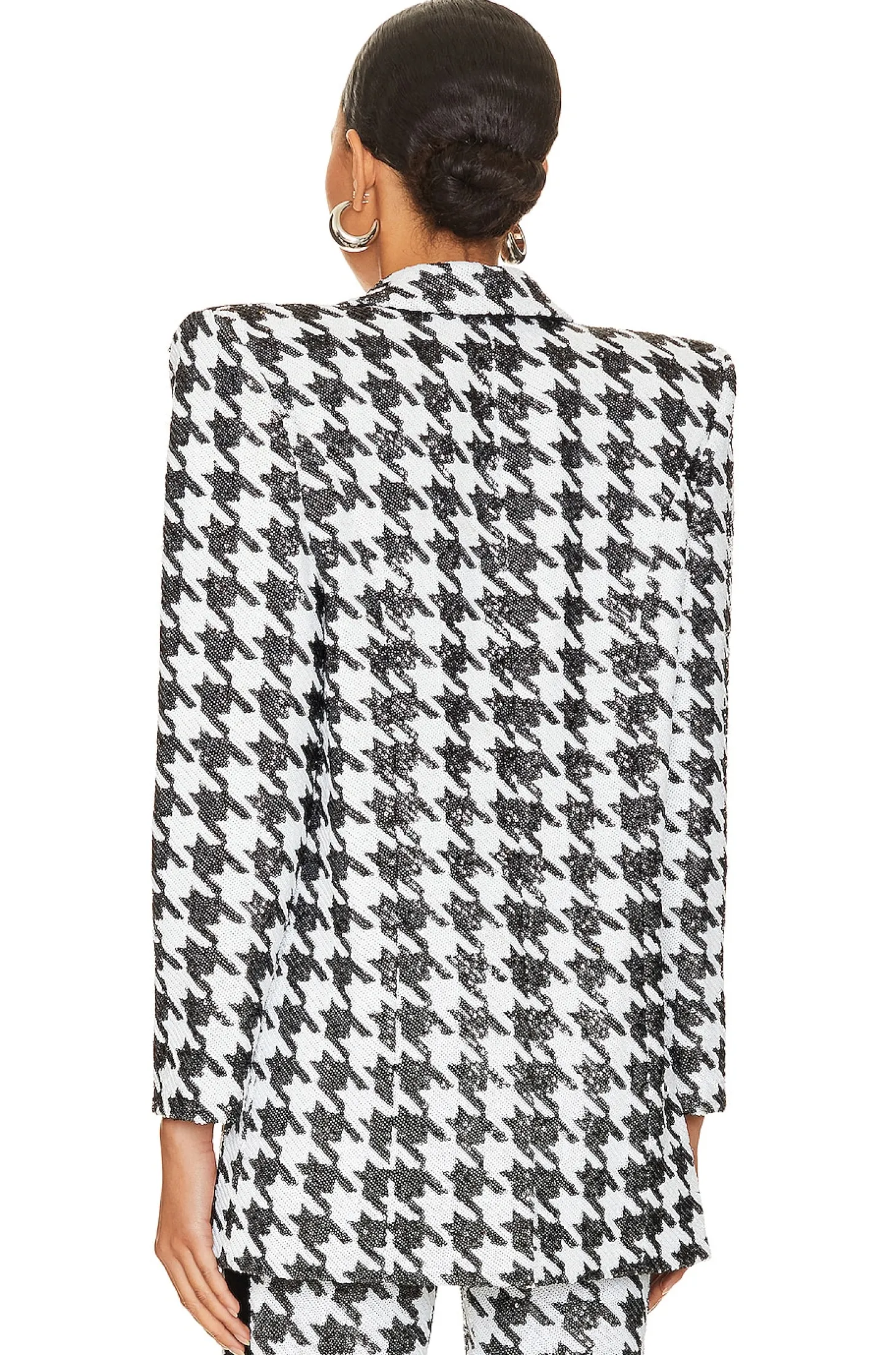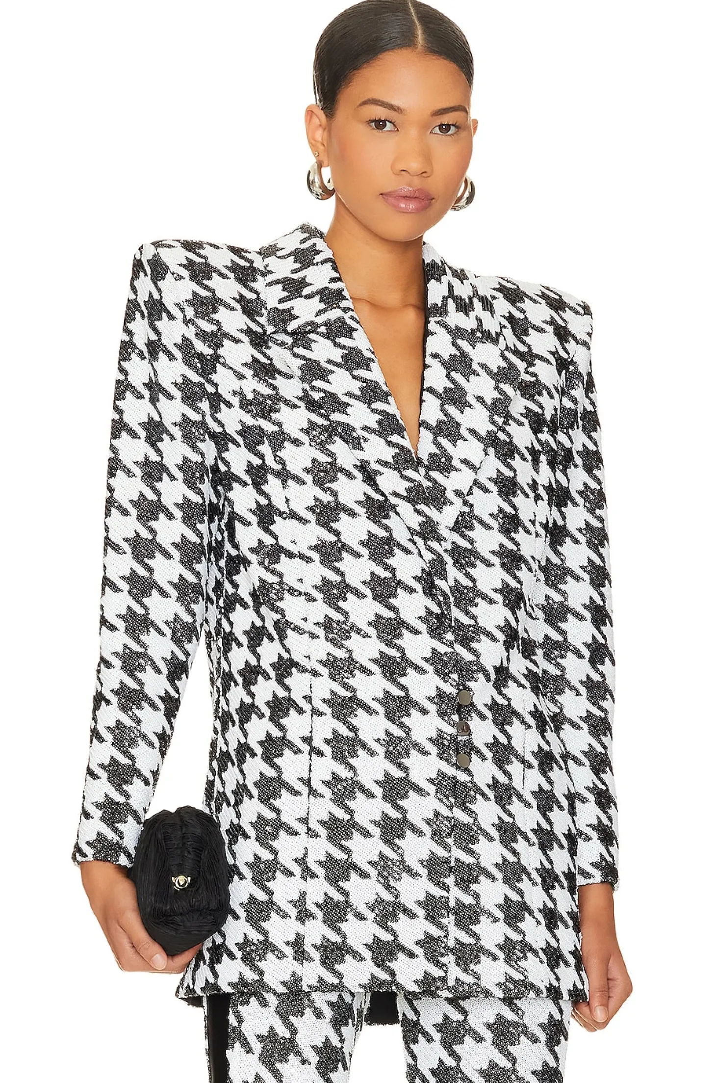 Polyester blend.Imported.Dry clean recommended.Front button closure.Padded shoulders.Side seam pockets.Heavyweight sequin embellished fabric.Item not sold as set