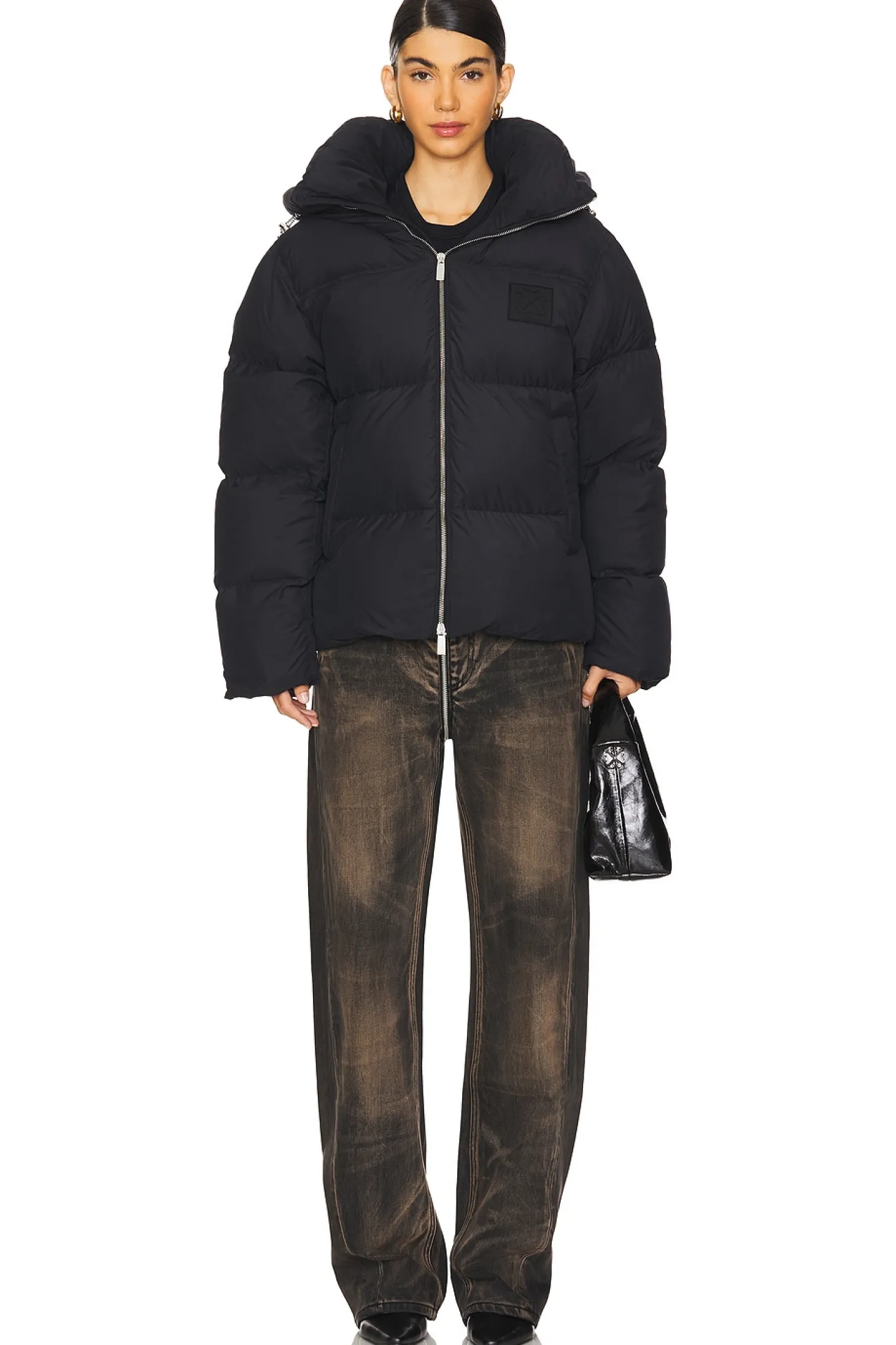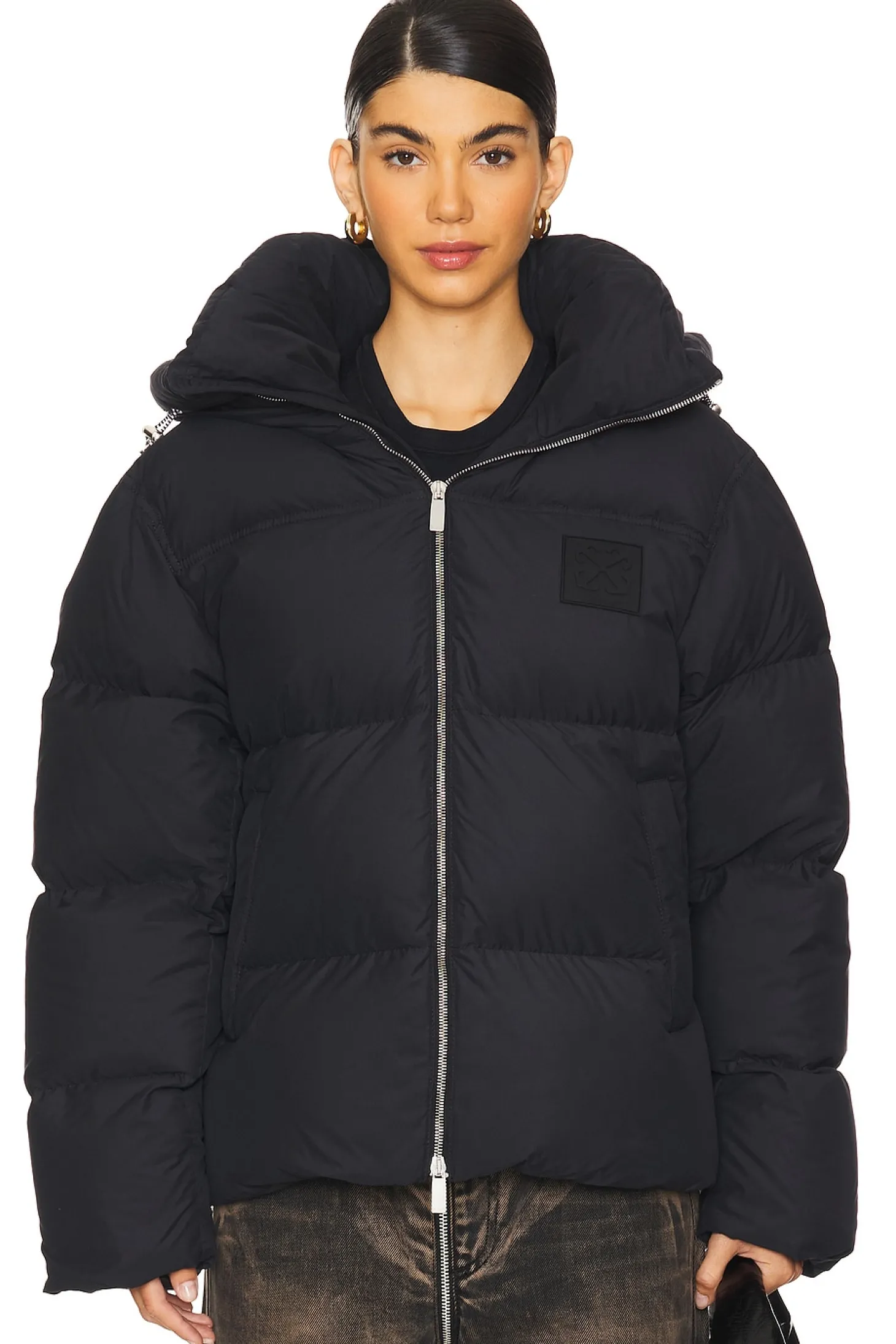 Self: 100% polyester Lining: 100% polyester Padding: 80% down 20% feathers.Made in Romania.Machine wash.Two-way front zipper.Side pockets and single interior breast pockets.Elastic cuffs Pull-cord waistband and neckline.Padded ripstop fabric