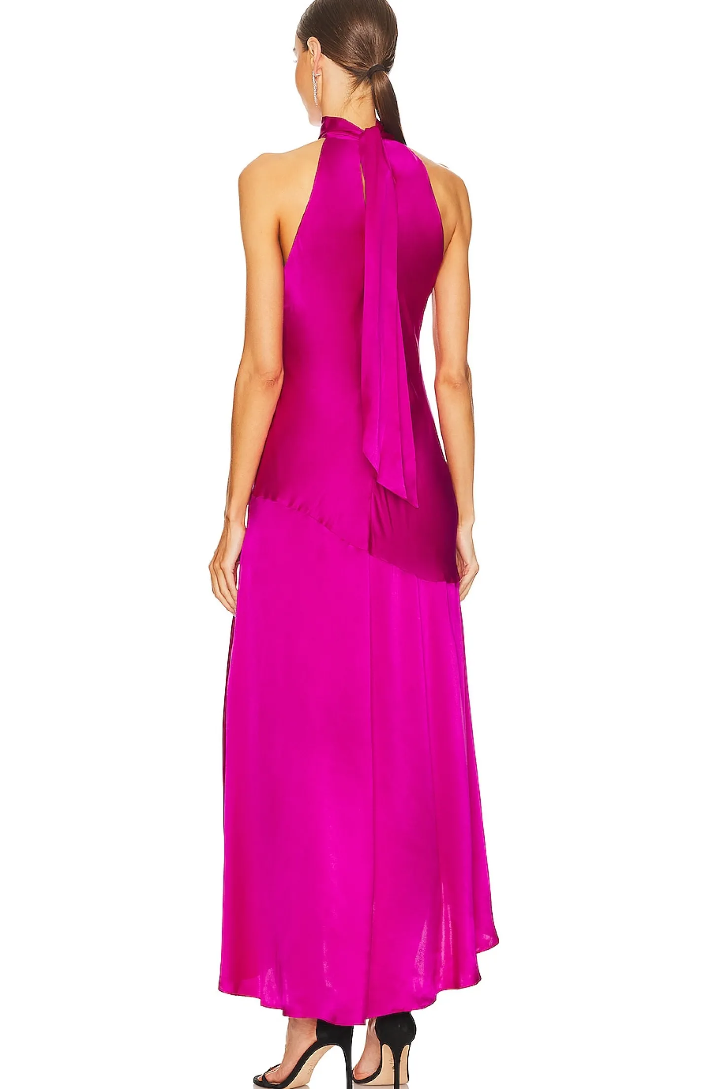 Self: 100% silk Lining: 100% polyester.Made in China.Dry clean only.Fully lined.Hidden back zipper closure.Turtleneck styling with back tie closure.Asymmetric hem Satin fabric