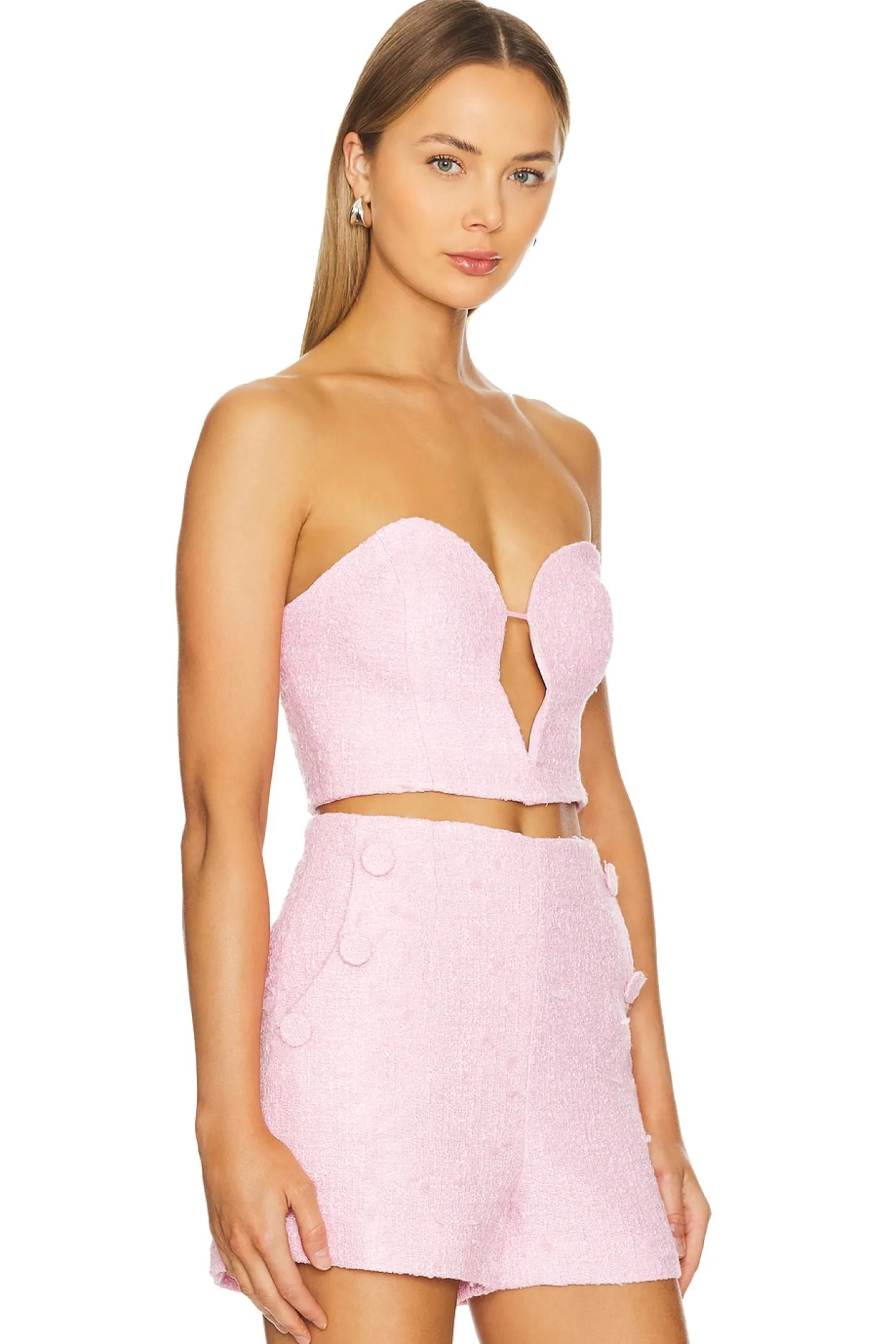 Self: 100% polyester Lining: 95% polyester 5% elastane.Made in China.Hand wash.Exposed back zipper closure.Front cut-out detail.Boned sides.Lightweight tweed fabric.Item not sold as a set