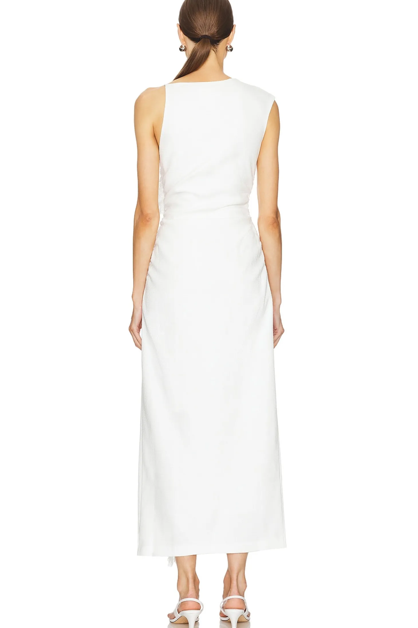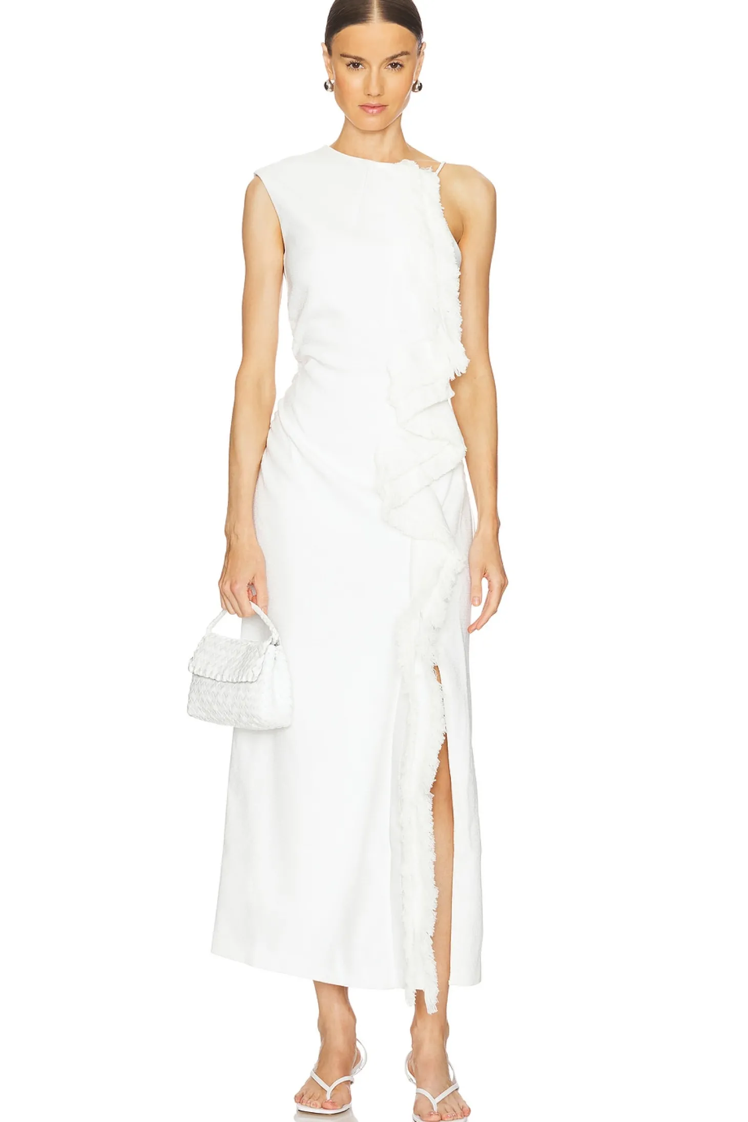 Self: 100% polyester Lining: 100% viscose Contrast Fabric: 100% cotton.Made in China.Dry clean only.Fully lined.Partial hidden side zip closure.Midweight twill fabric with fringe trim