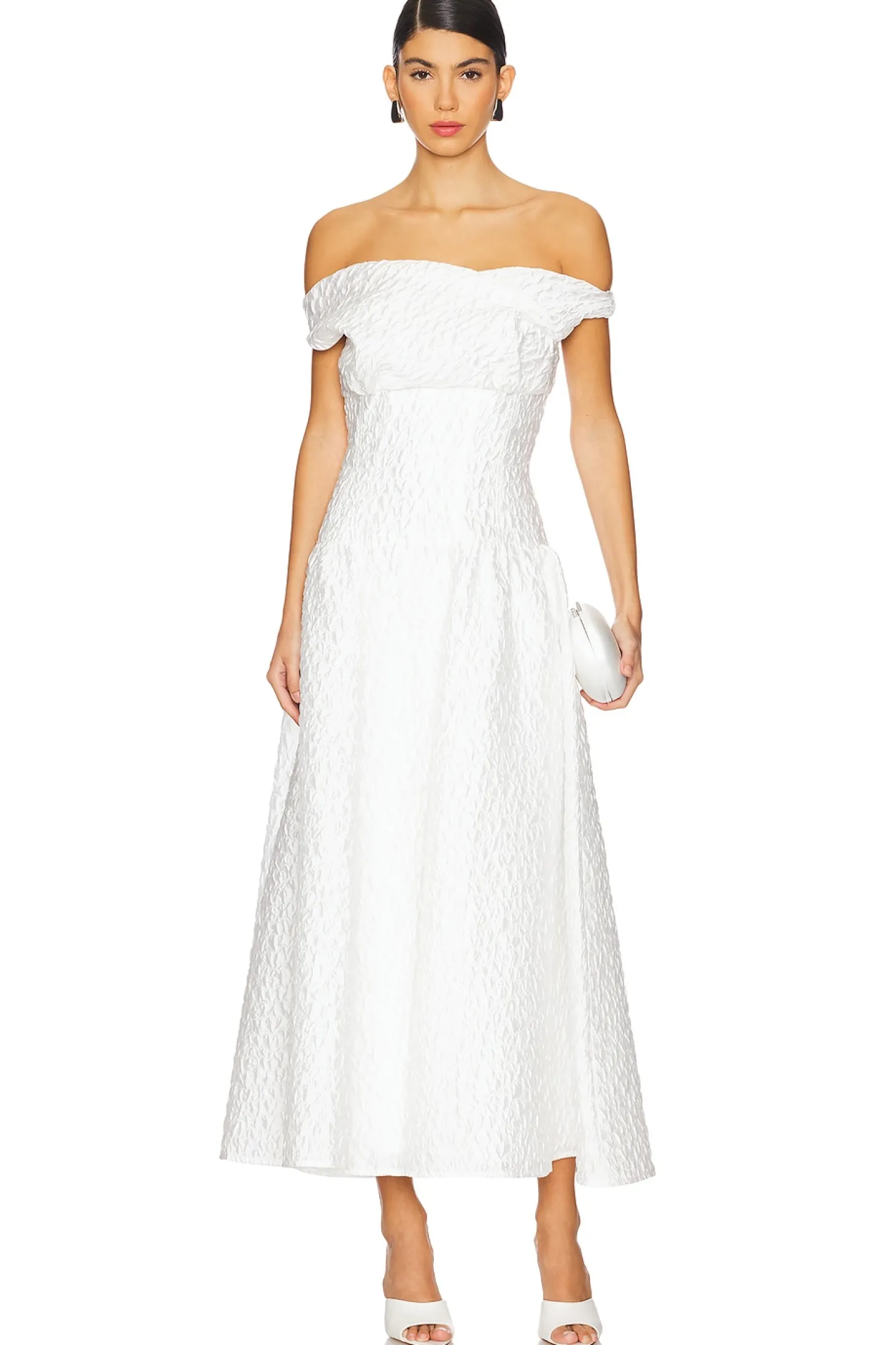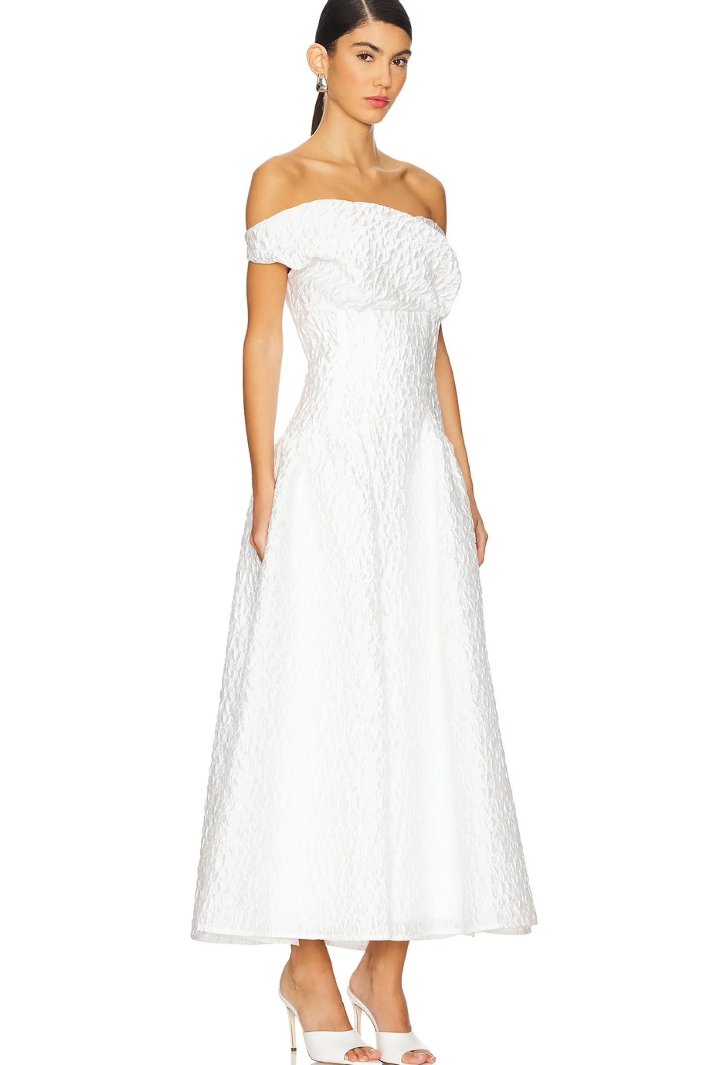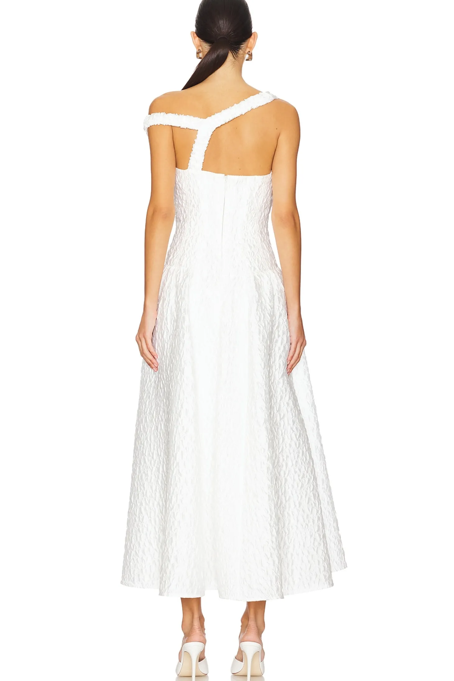 Self: 56% polyester 44% polyamide Lining: 100% polyester.Made in China.Machine wash.Fully lined.Hidden back zip closure.Optional one shoulder styling.Lightweight seersucker fabric.Neckline to hem measures approx 53" in length