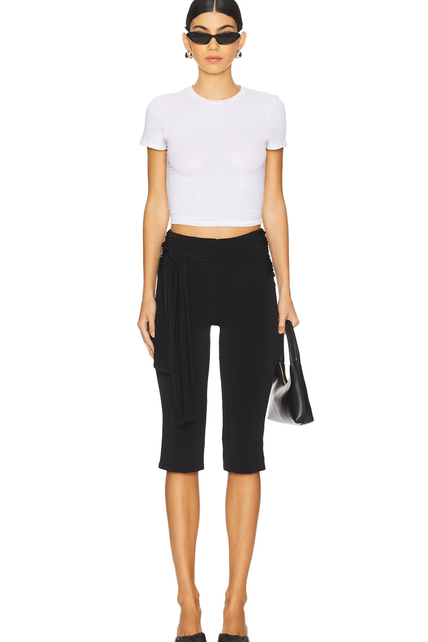 95% polyester 5% elastane.Made in China.Hand wash.Pull-on styling with elastic waistband.Tie-up accent waist.Jersey fabric