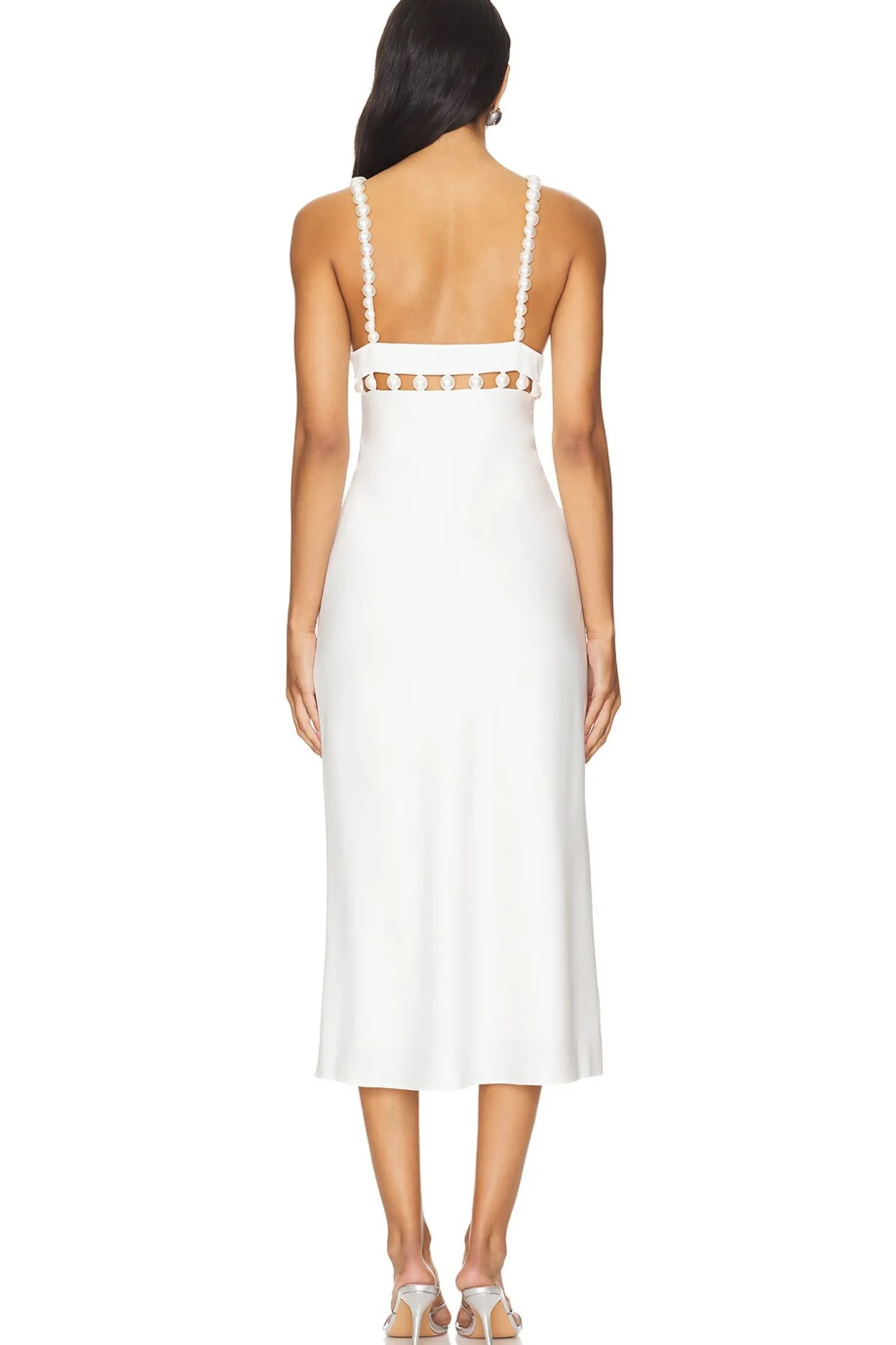 Self: 80% acetate 20% polyester Lining: 97% polyester 3% spandex.Made in China.Dry clean only.Fully lined.Unpadded cups.Hidden side zipper closure.Satin fabric with cut-out design and pearl accents