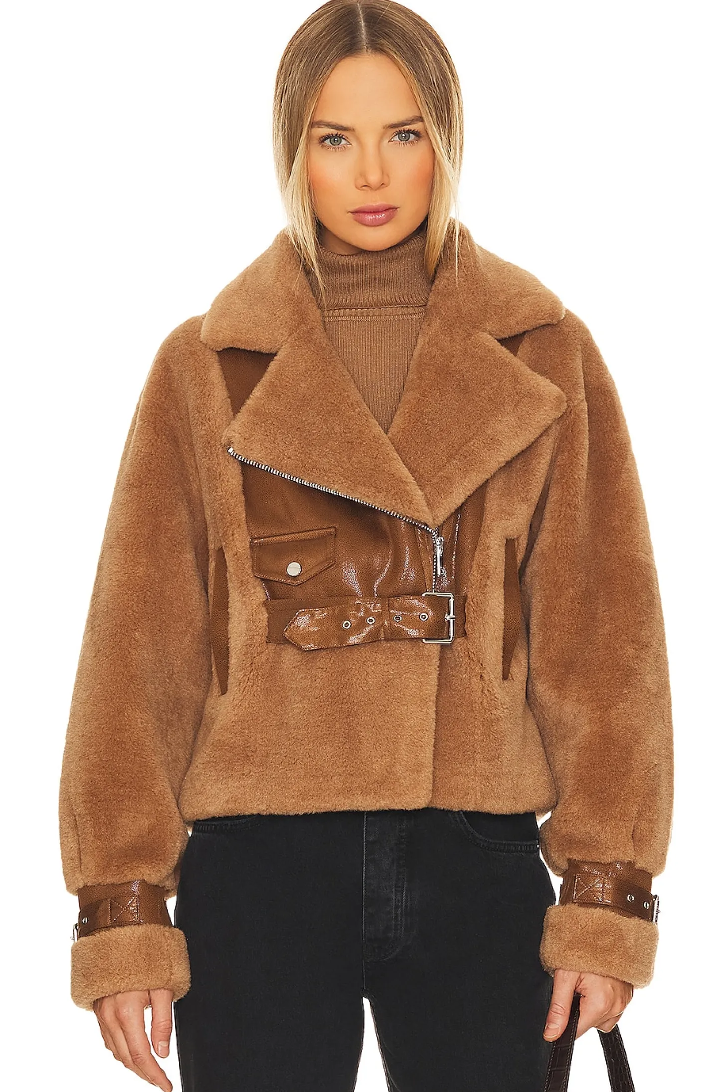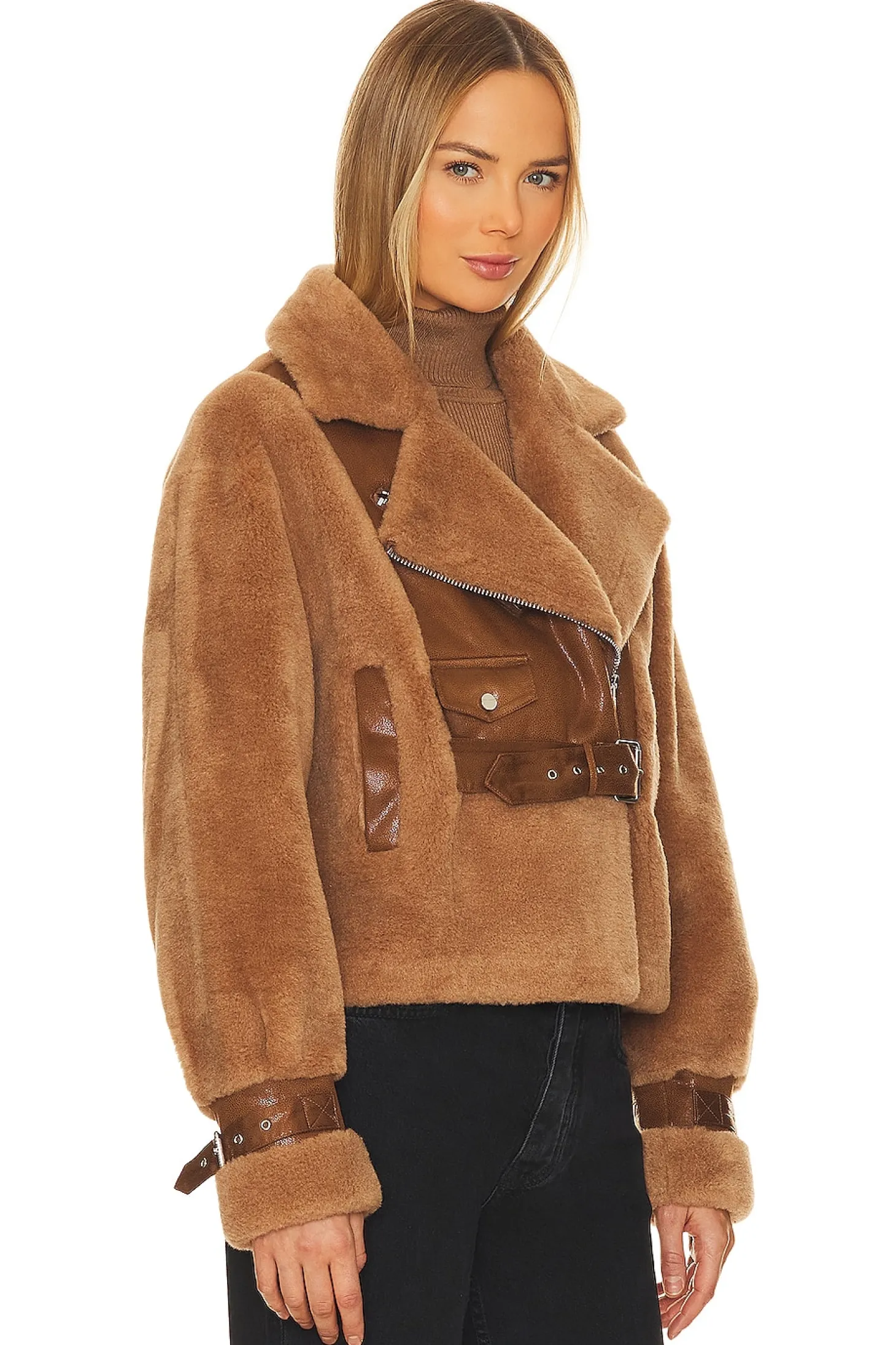 100% polyester.Made in China.Dry clean only.Front zipper closure.Attached waist belt with buckle closure.4-pocket styling.Belted cuffs.Faux fur fabric.The coziest faux fur jacket, designed to keep you warm from the chalet to the city.