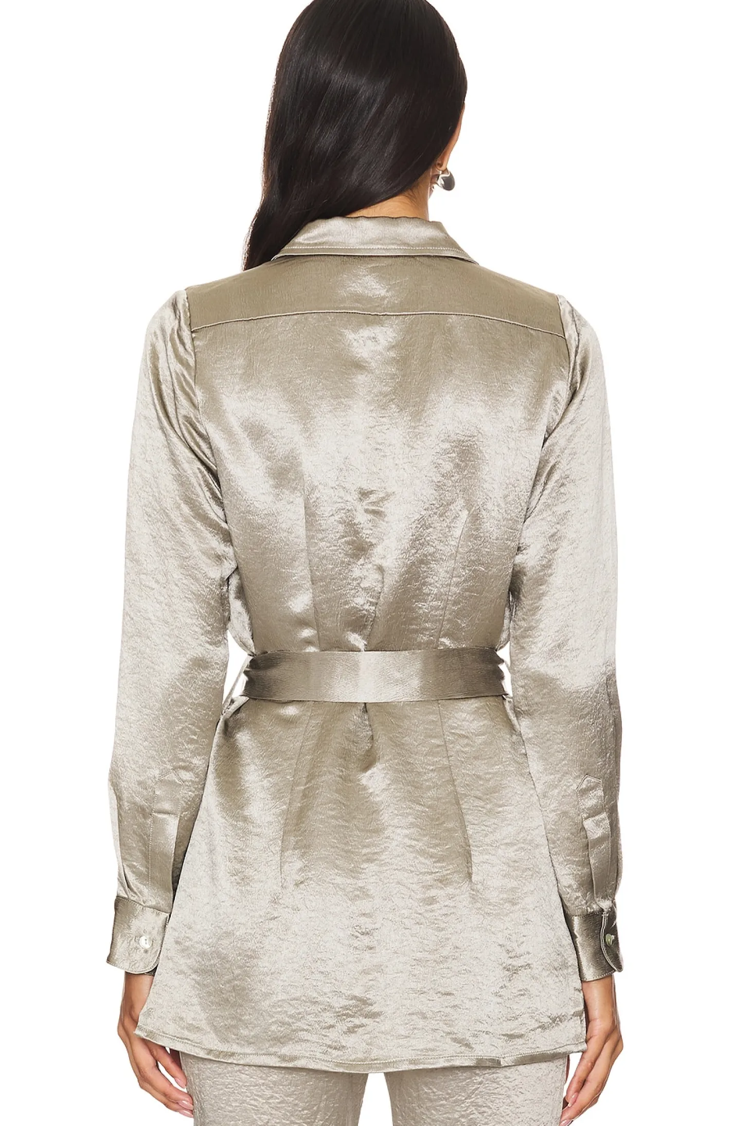 Sateen textile.Imported.Dry clean recommended.Front button closure with optional waistbelt.Four front cargo pockets.Buttoned cuffs.Textured sateen fabric.Item not sold as set