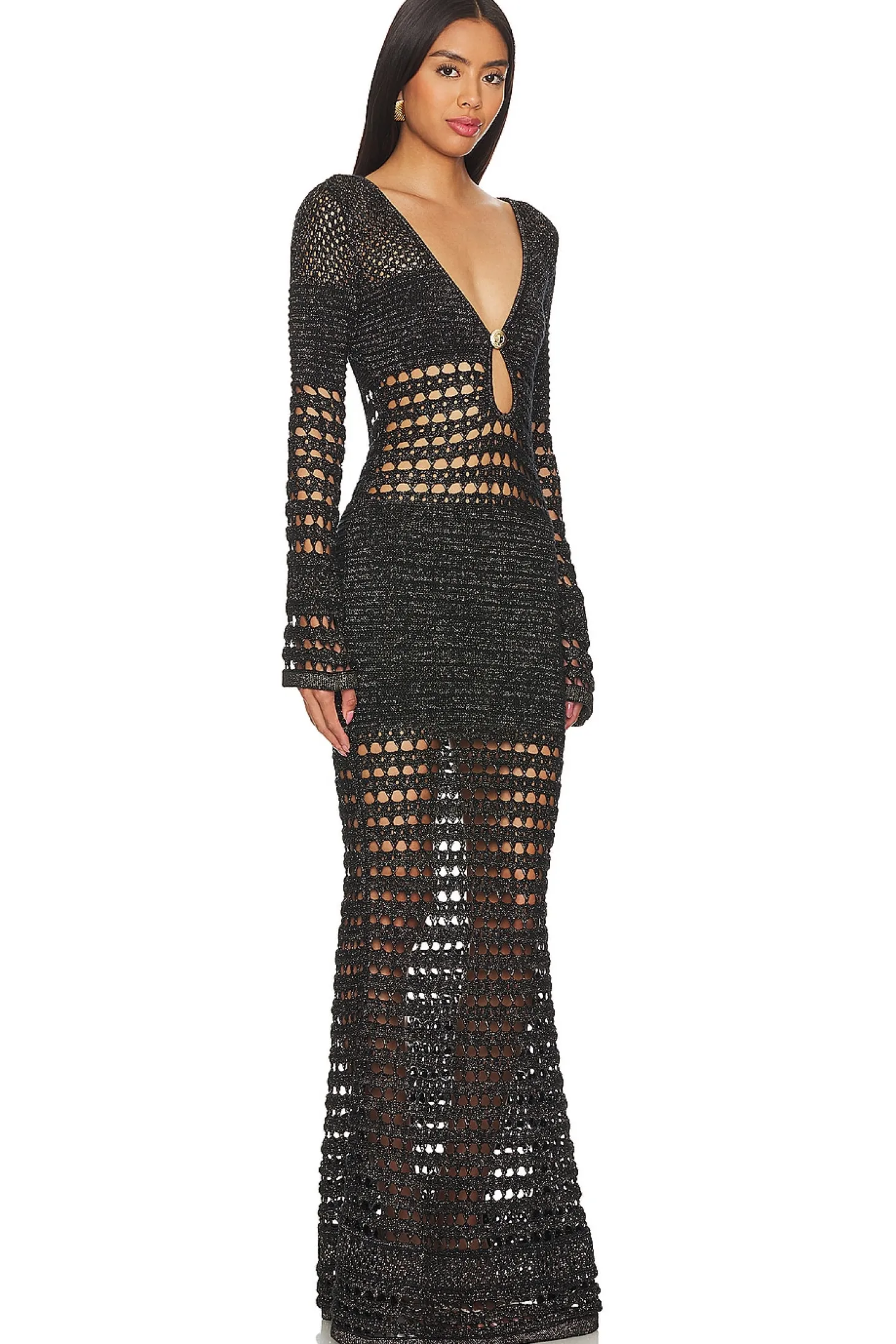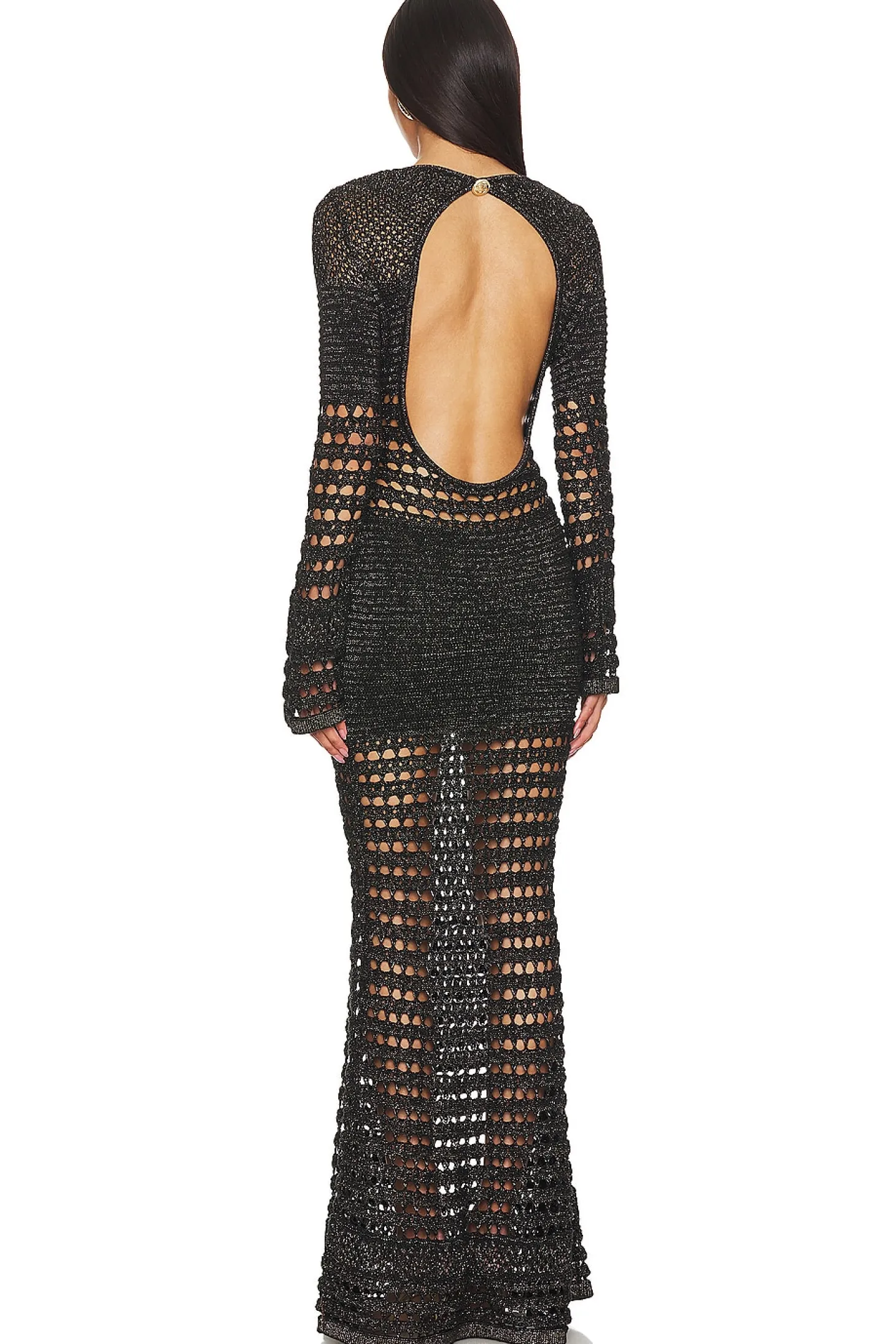 85% cotton 10% polyester 5% metallic.Made in China.Hand wash.Unlined.Front and back button closures.Crochet knit fabric with metallic threading.Garment is intentionally sheer, undergarments will show through.