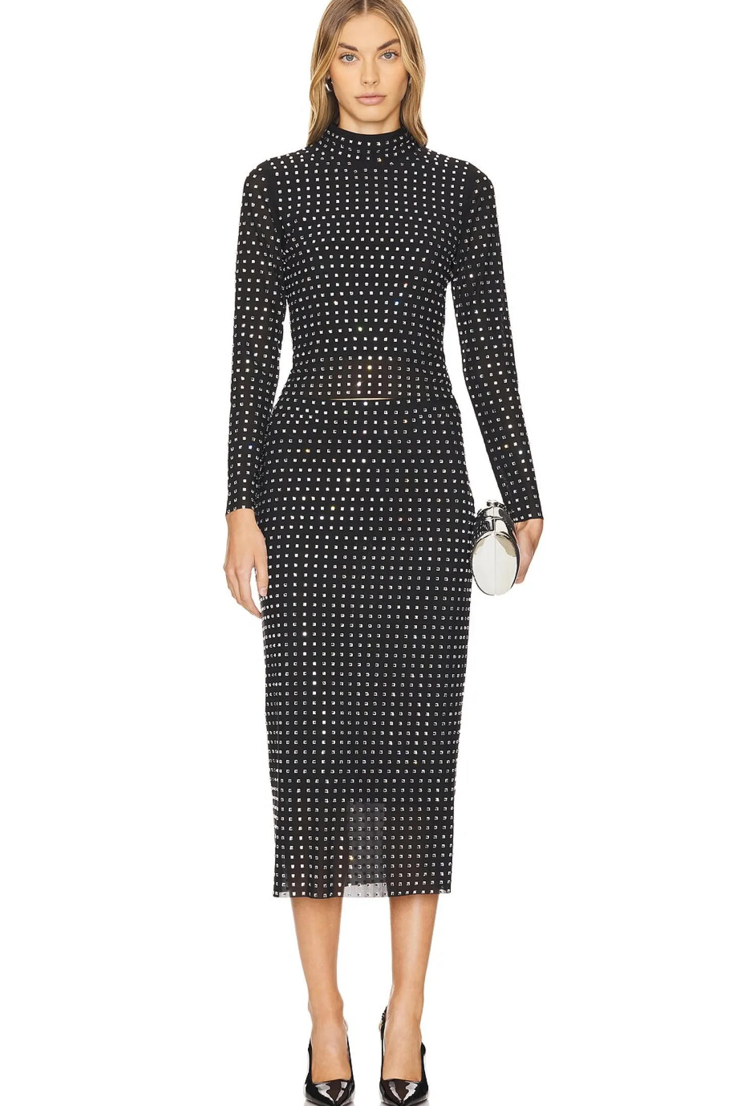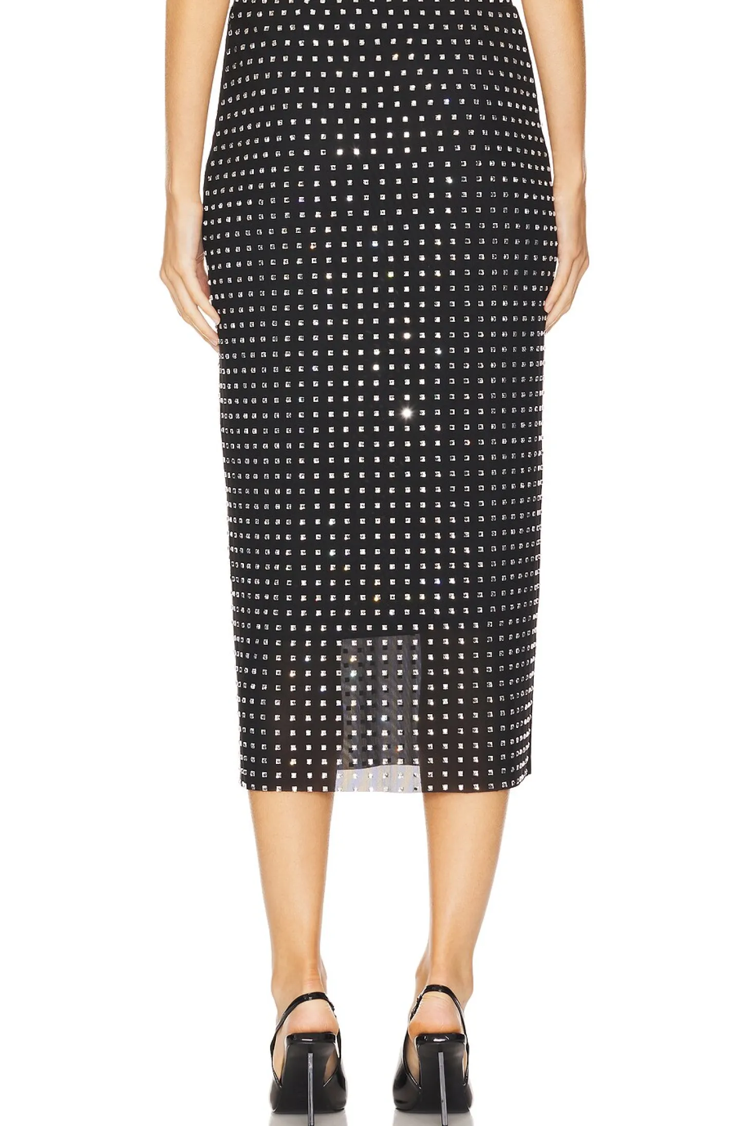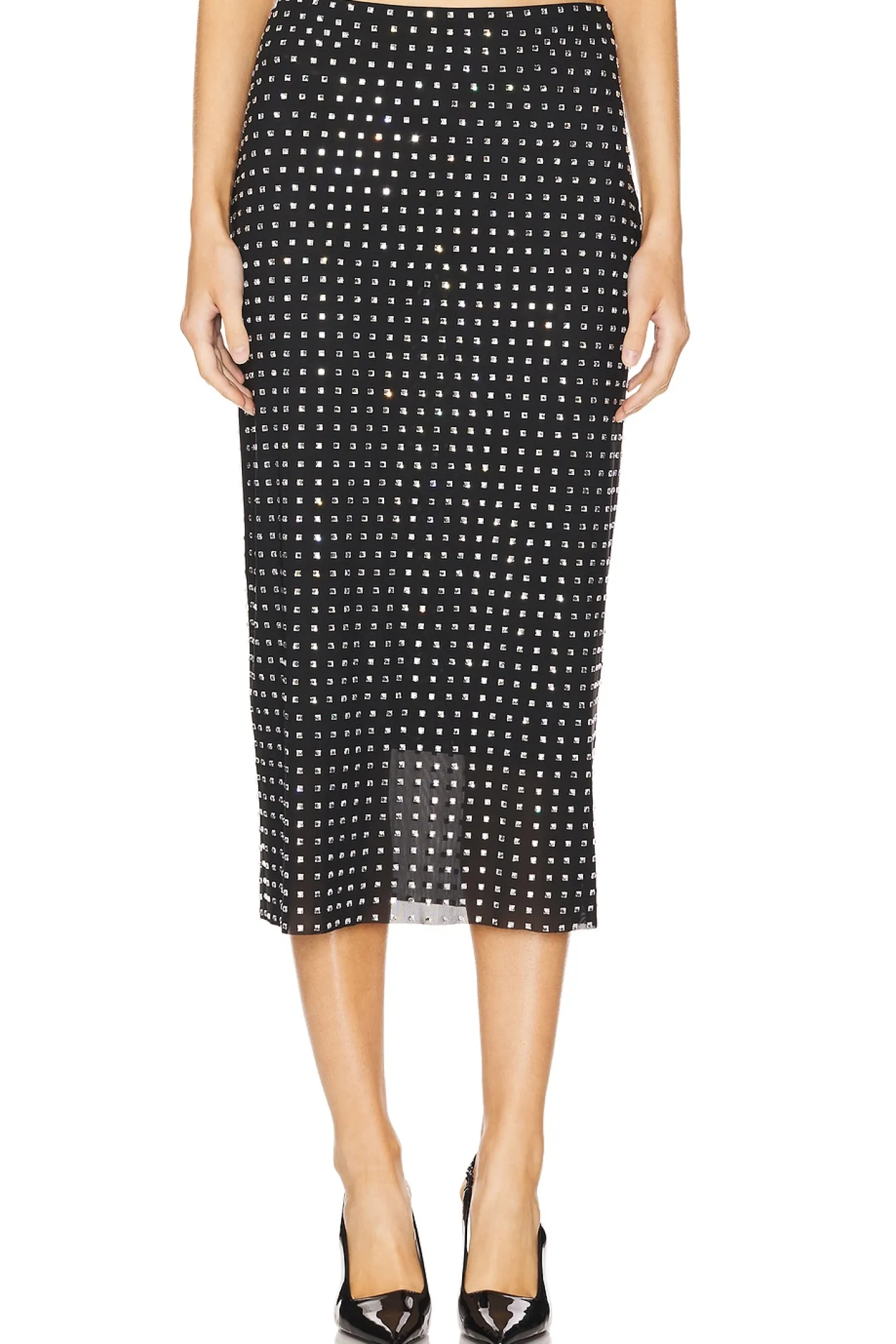 88% polyester 12% elastane.Made in China.Hand wash.Fully lined.Hidden side zipper closure.Crystal embellished mesh fabric.Item not sold as a set.Skirt measures approx 31.5" in length