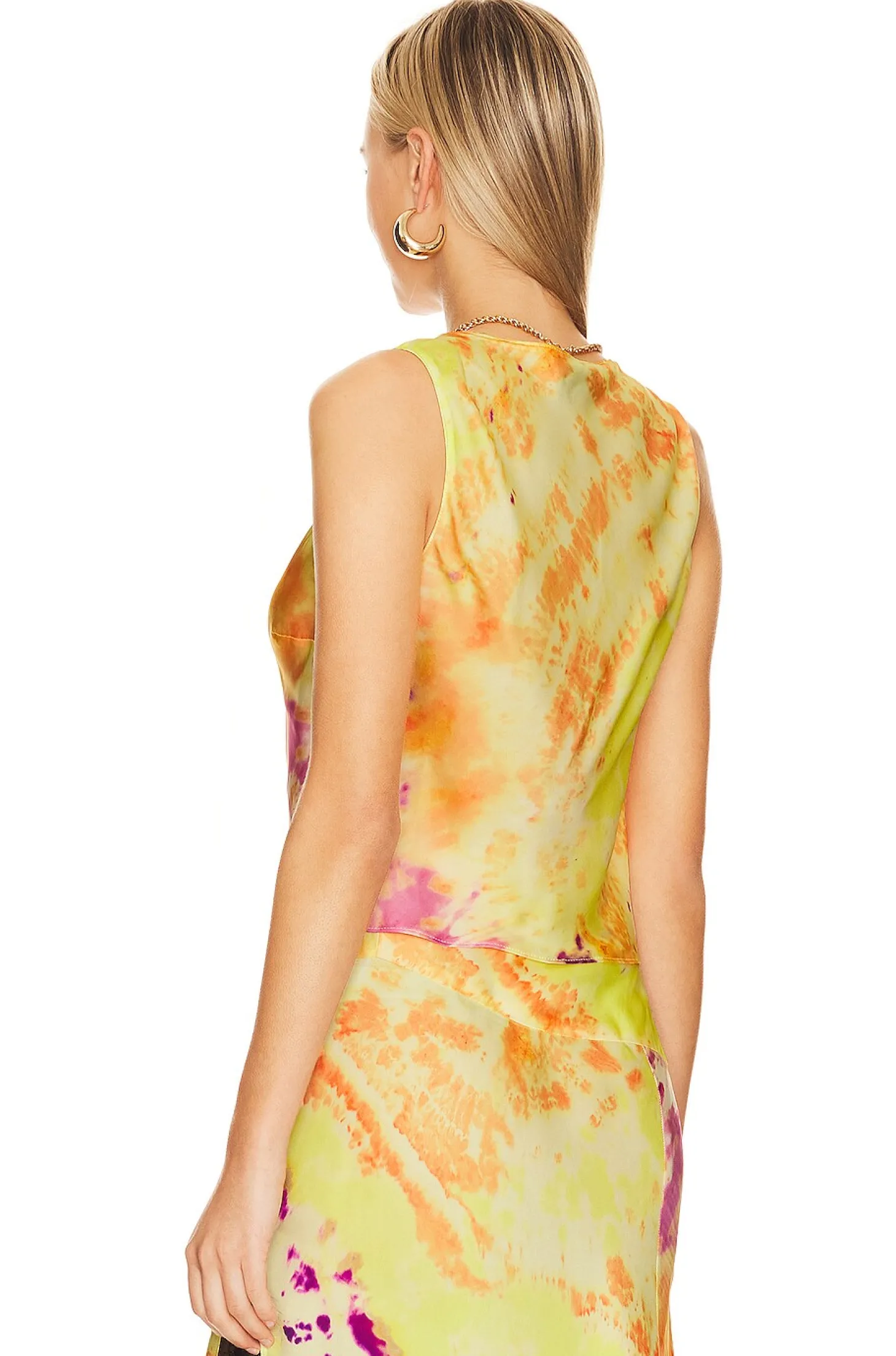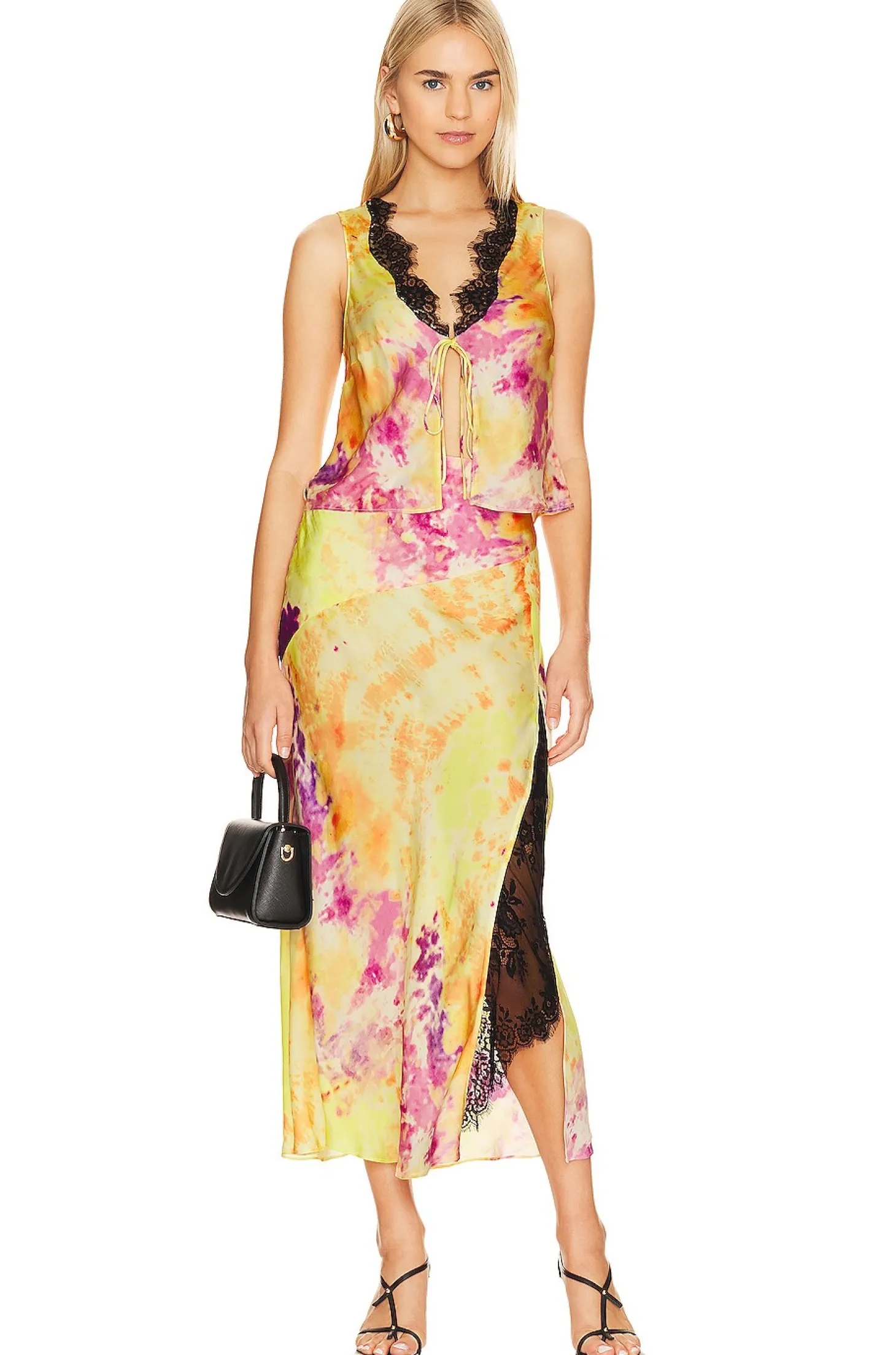 Self: 100% viscose Contrast Fabric: 100% nylon.Made in China.Dry clean only.Front bust tie closure.Lace neckline trim.Satin fabric.Item not sold as a set.Due to the unique wash, colors and patterns may vary slightly