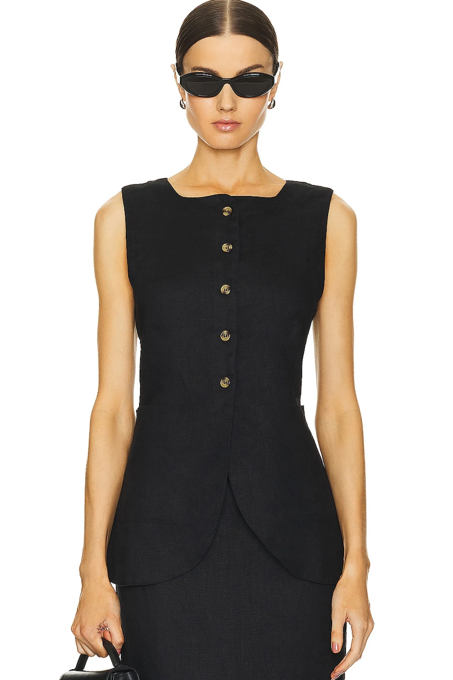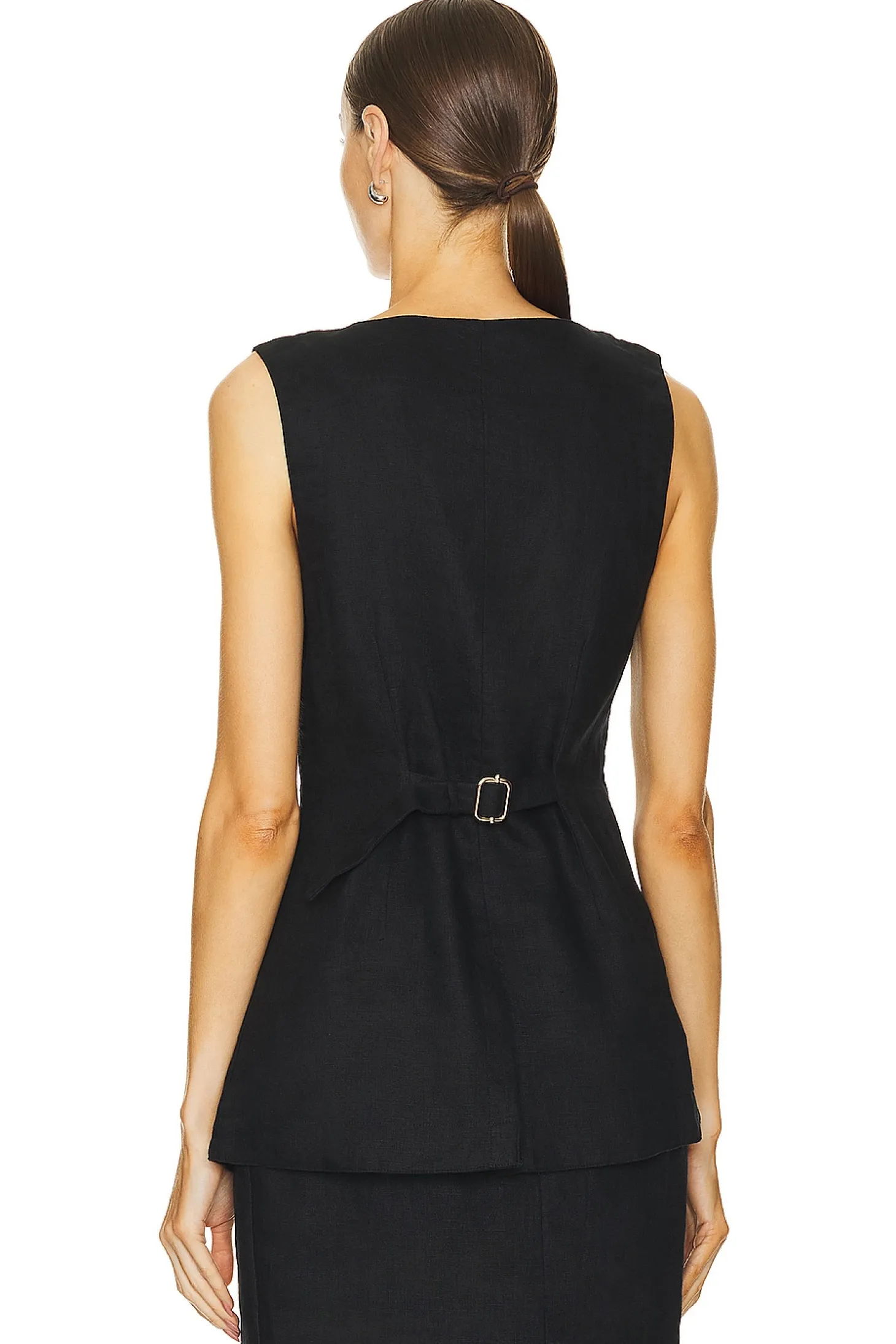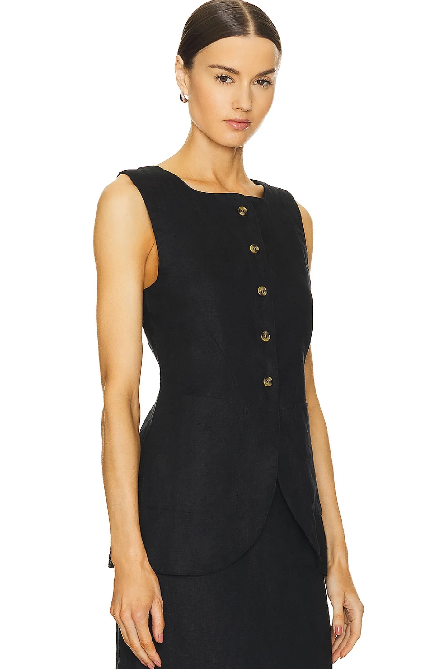 Self: 100% linen Lining: 100% cotton.Made in India.Hand wash.Front button closure.Front slip pockets.Adjustable back strap.Lightweight linen fabric