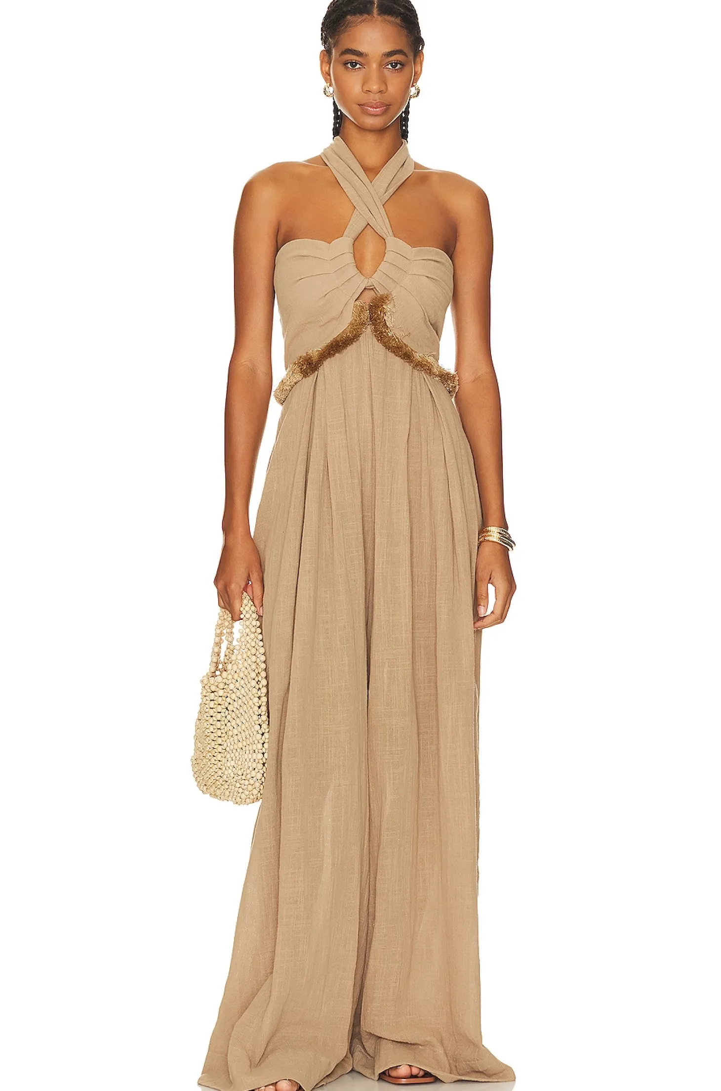 100% cotton.Made in USA.Machine wash.Exposed back zipper closure.Halterneck styling with tie closure.Bust cut-out.Lightweight linen gauze fabric with fringe trim