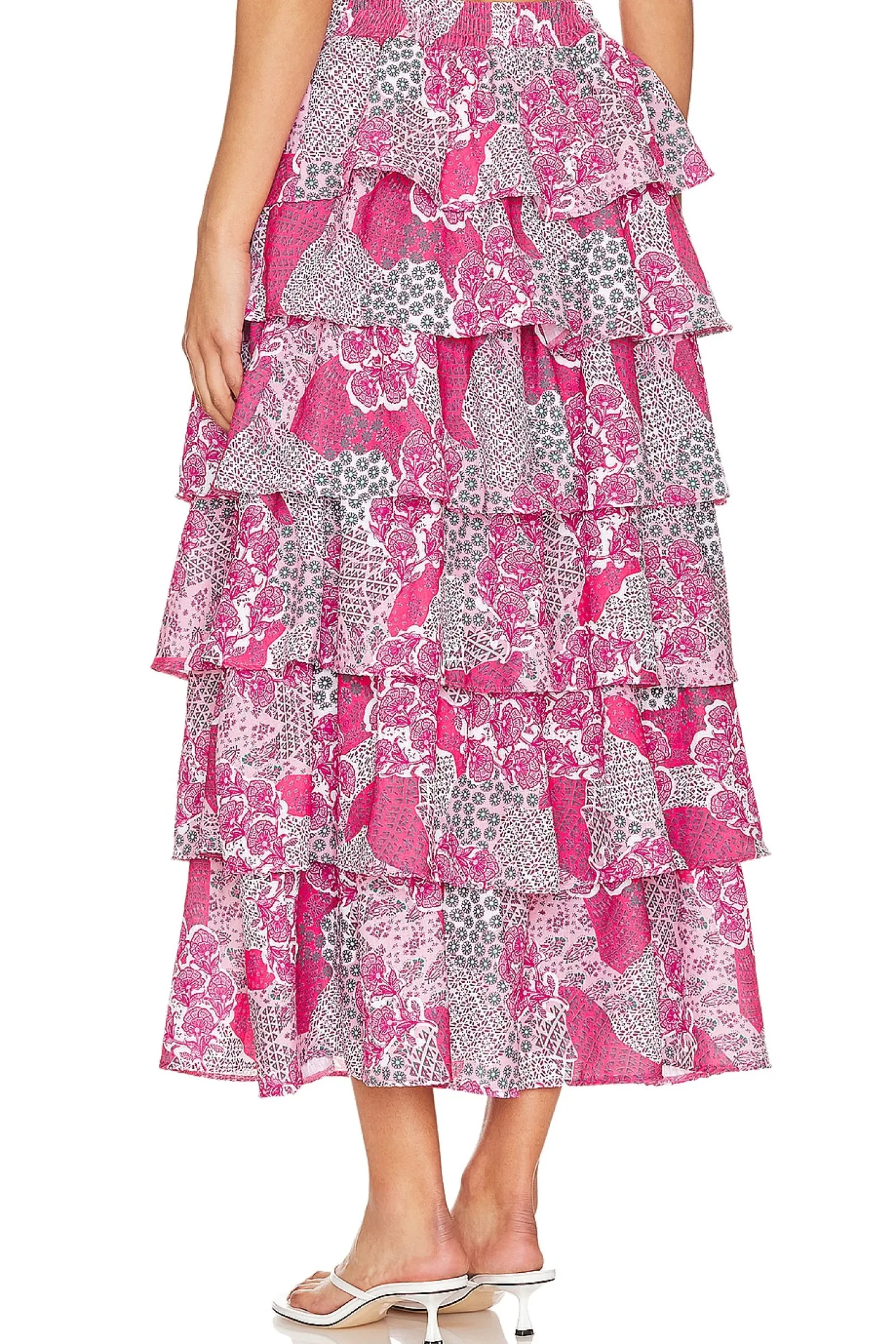 100% cotton Lining double:100% cotton .Made in Colombia.Hand wash cold.Partially lined.Pull-on styling with elastic back waistband.Lightweight ruffle crepe fabric.Skirt measures approx 32" in length