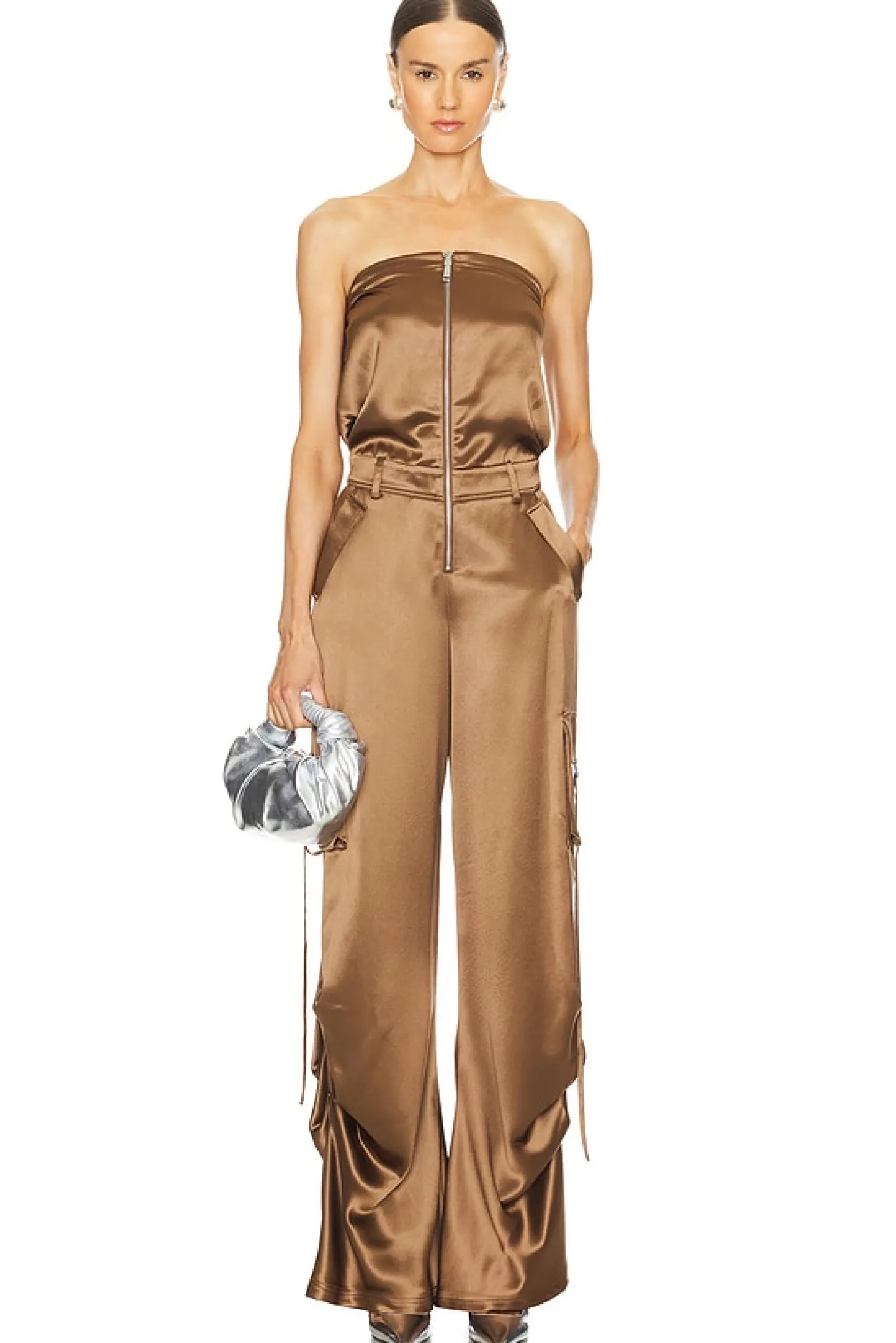 Self: 78% acetate 24% polyester Lining: 97% polyester 3% spandex.Made in China.Dry clean only.Front zipper closure.4-pocket styling includes two cargo buckle pockets.Satin fabric with back flap detail.Neckline to hem measures approx 55" in length 25" at the knee breaks to 26" at the leg opening