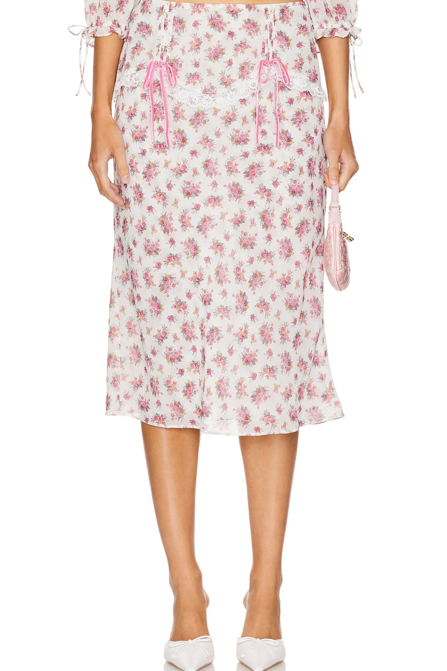 Self: 100% recycled polyester Lining: 100% recycled polyester.Made in China.Dry clean only.Fully lined.Hidden side zipper closure.Lightweight satin fabric with lace trim and tie accents.Item not sold as set.Skirt measures approx 28.5" in length