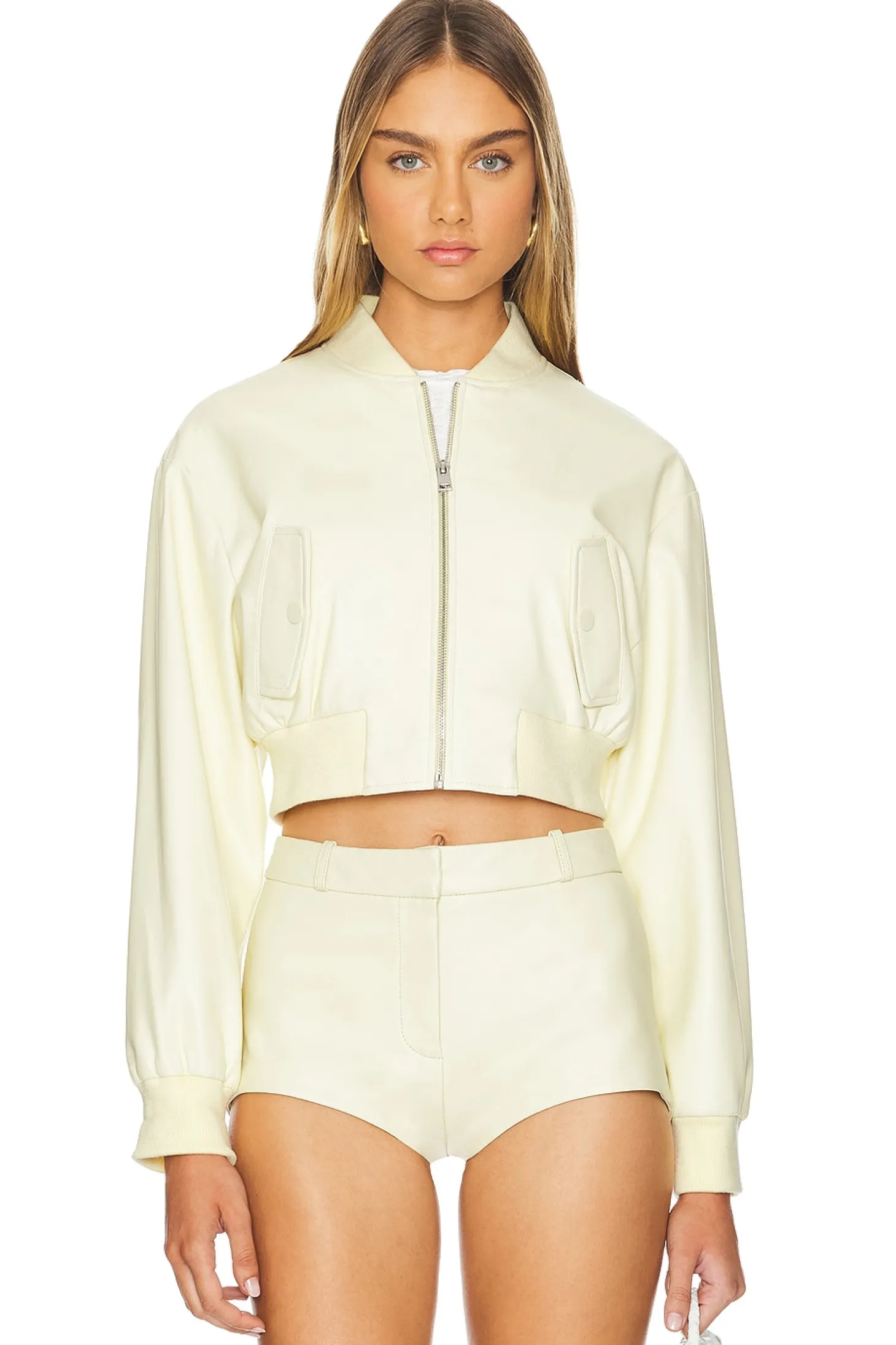 Self: 100% polyurethane Backing: 100% polyester Lining: 100% polyester Rib: 95% polyester 5% spandex.Made in China.Hand wash.Front zipper closure.Slant pockets with snap closure.Elastic cuffs and hem.Item not sold as set.Faux leather