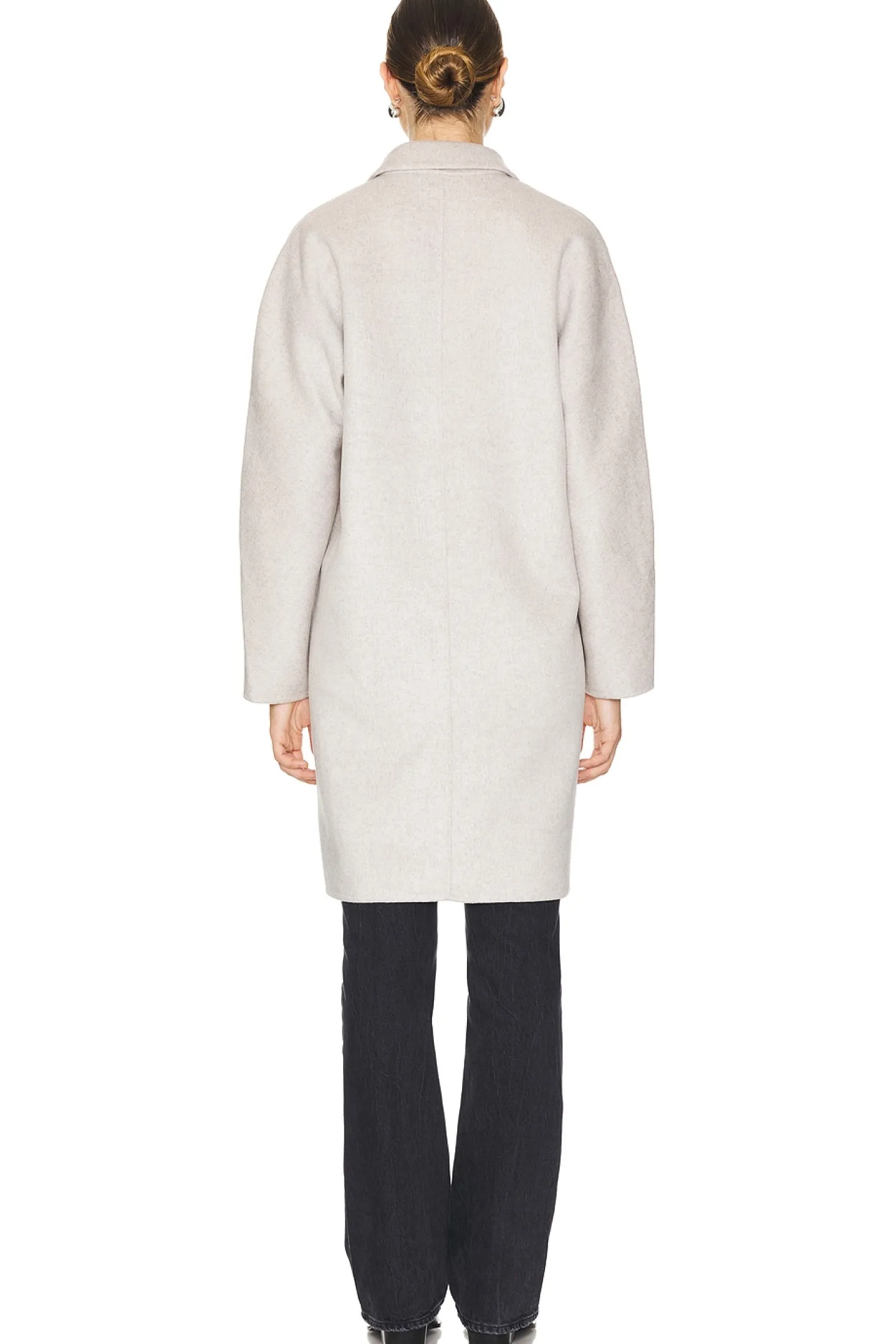 51% wool 49% polyester.Made in China.Dry clean only.Singular front button closure.Side pouch pockets.Brushed twill fabric