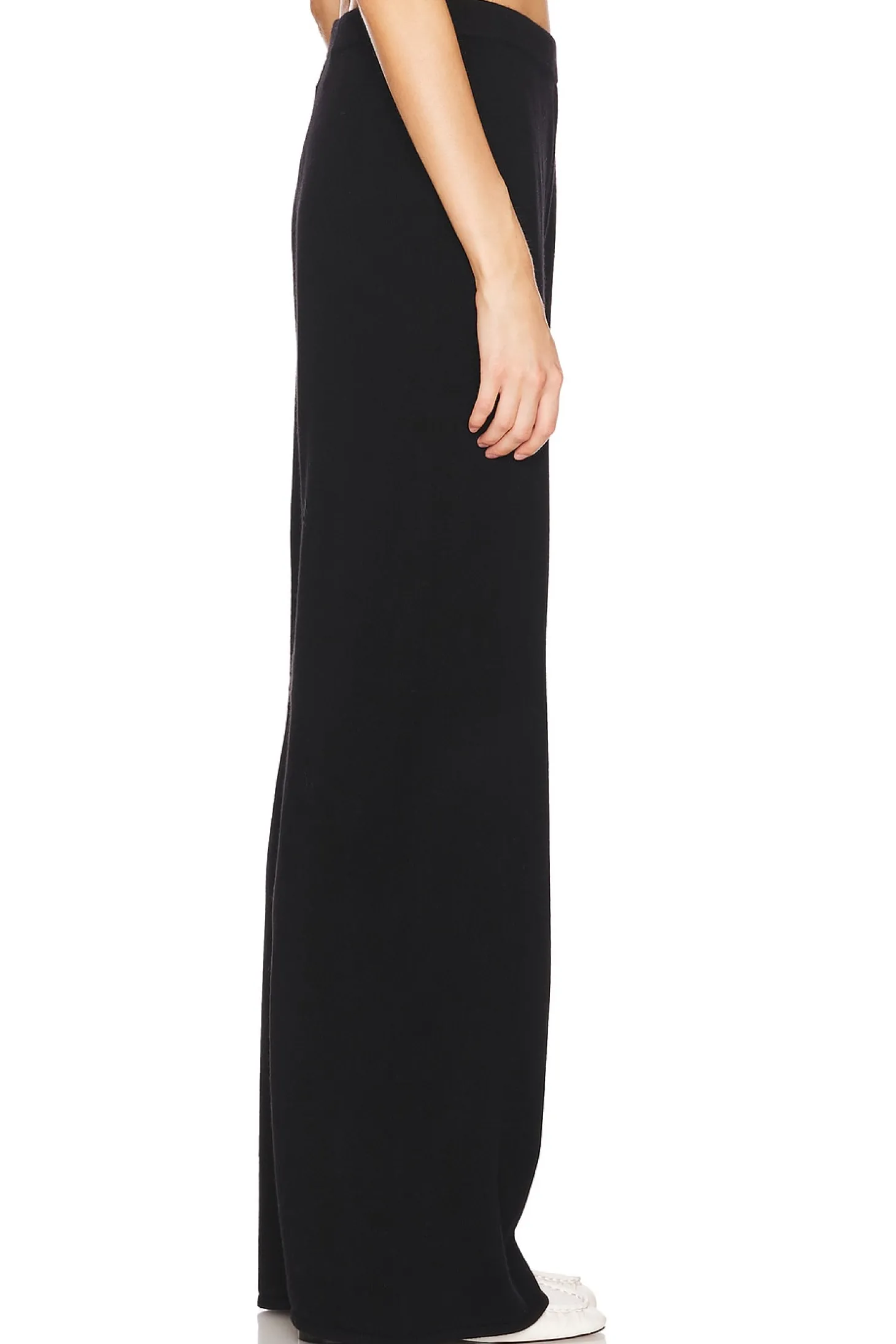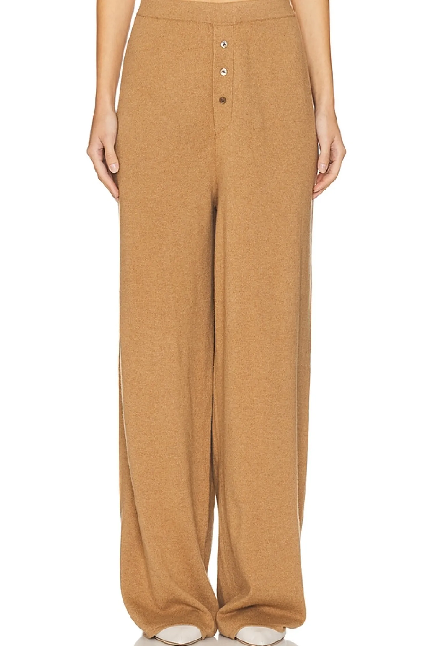 100% cashmere.Made in China.Hand wash.Pull-on styling with elastic waistband.Faux button fly.Knit fabric.Item not sold as set.24" at the knee and 24" at the leg opening