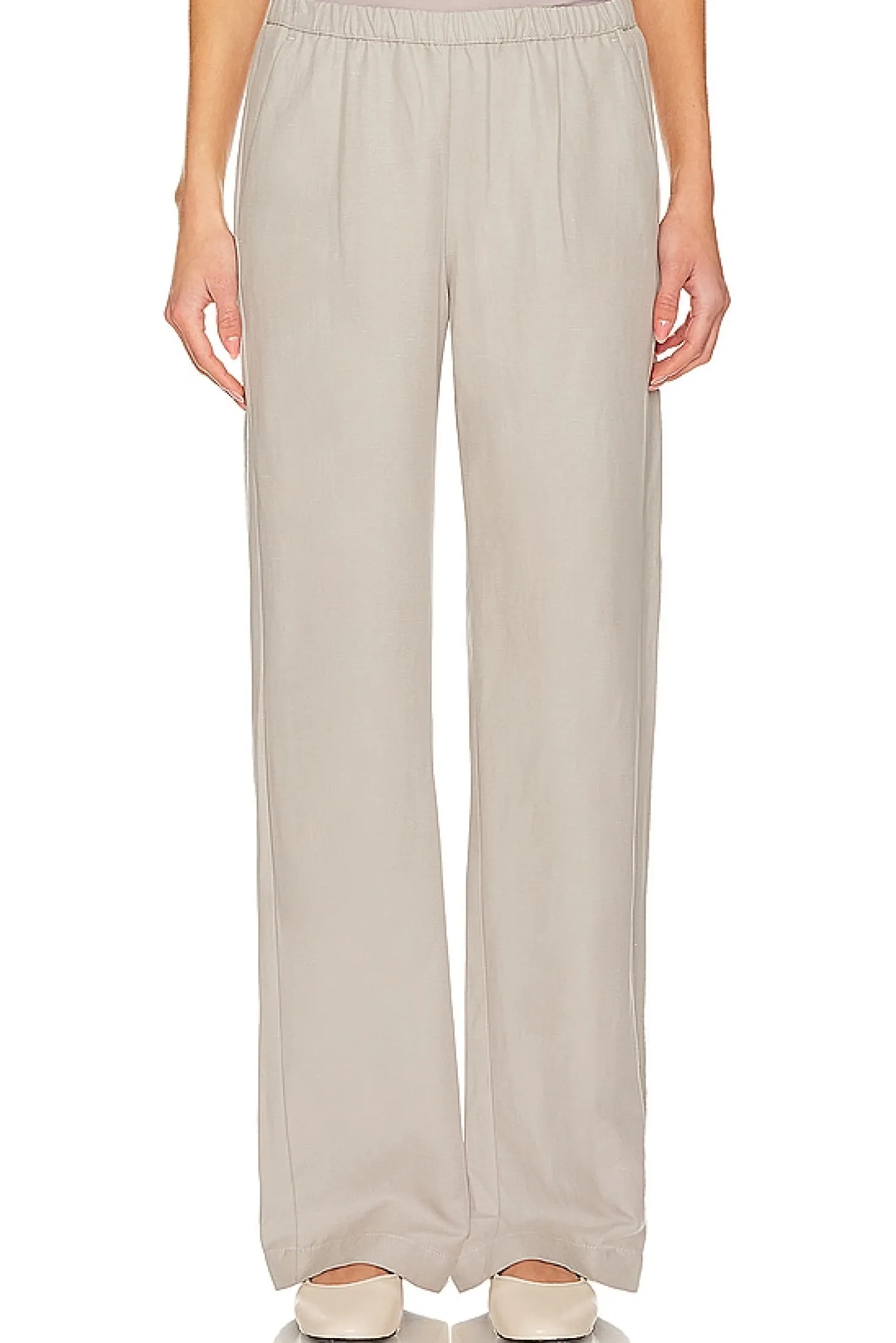 Self: 48% tencel 30% linen 22% cotton Lining: 100% rayon.Made in USA.Machine wash.Elastic waistband.Side slant pockets.Linen fabric.This pant is designed to wear long, with a 33" inseam, to accommodate all heights and shoe choices. The length may be altered..19" at the knee and 19" at the leg opening