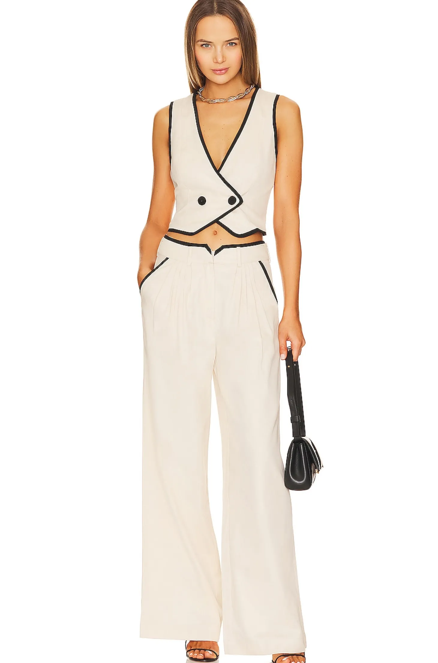 Self: 51% cotton 49% lyocell Lining: 100% cotton.Made in China.Machine wash.Zip fly with hook and bar closure.Side slant pockets.Faux welt pocket at back.Contrast waist and pocket trim Item not sold as a set.26" at the knee and 26" at the leg opening.The SOVERE Express Pant is a versatile closet staple. These can be worn to the office or during the day – just pair it with your favorite sneakers!