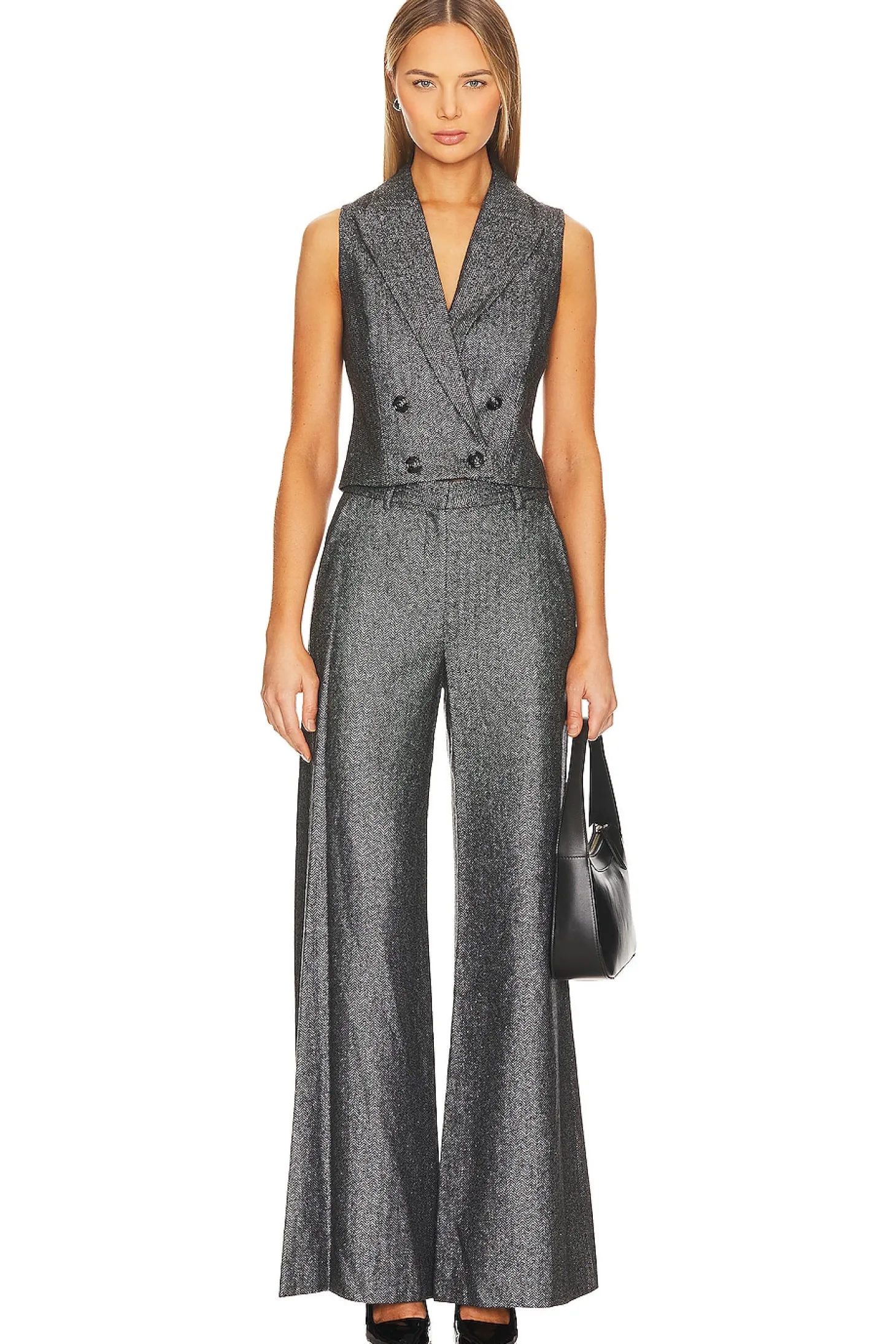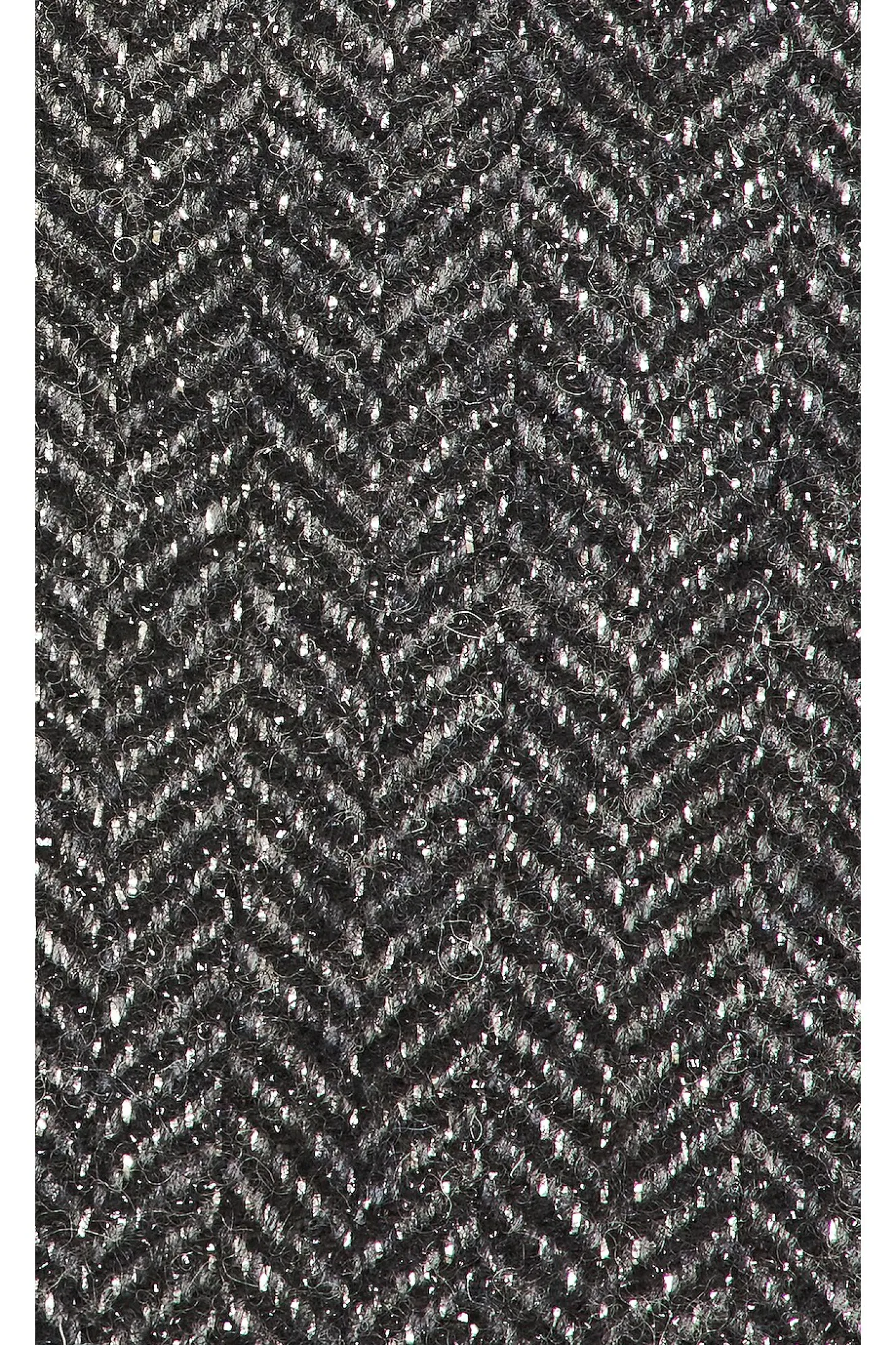 60% wool 27% nylon 9% polyester 4% other fibers.Made in China.Dry clean only.Double breasted button closure.Metallic threading throughout.Herringbone fabric.Item not sold as a set