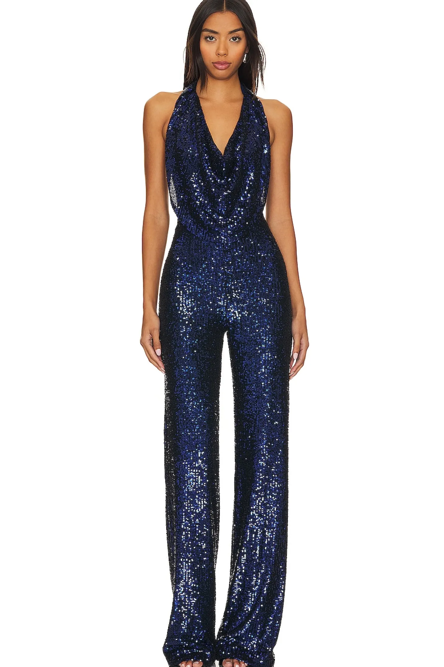 Self: 95% nylon 5% spandex Lining: 95% polyester 5% spandex.Made in Australia.Hand wash.Hidden back zipper closure.Halterneck styling with button loop closure.Fully sequin fabric with draped bodice