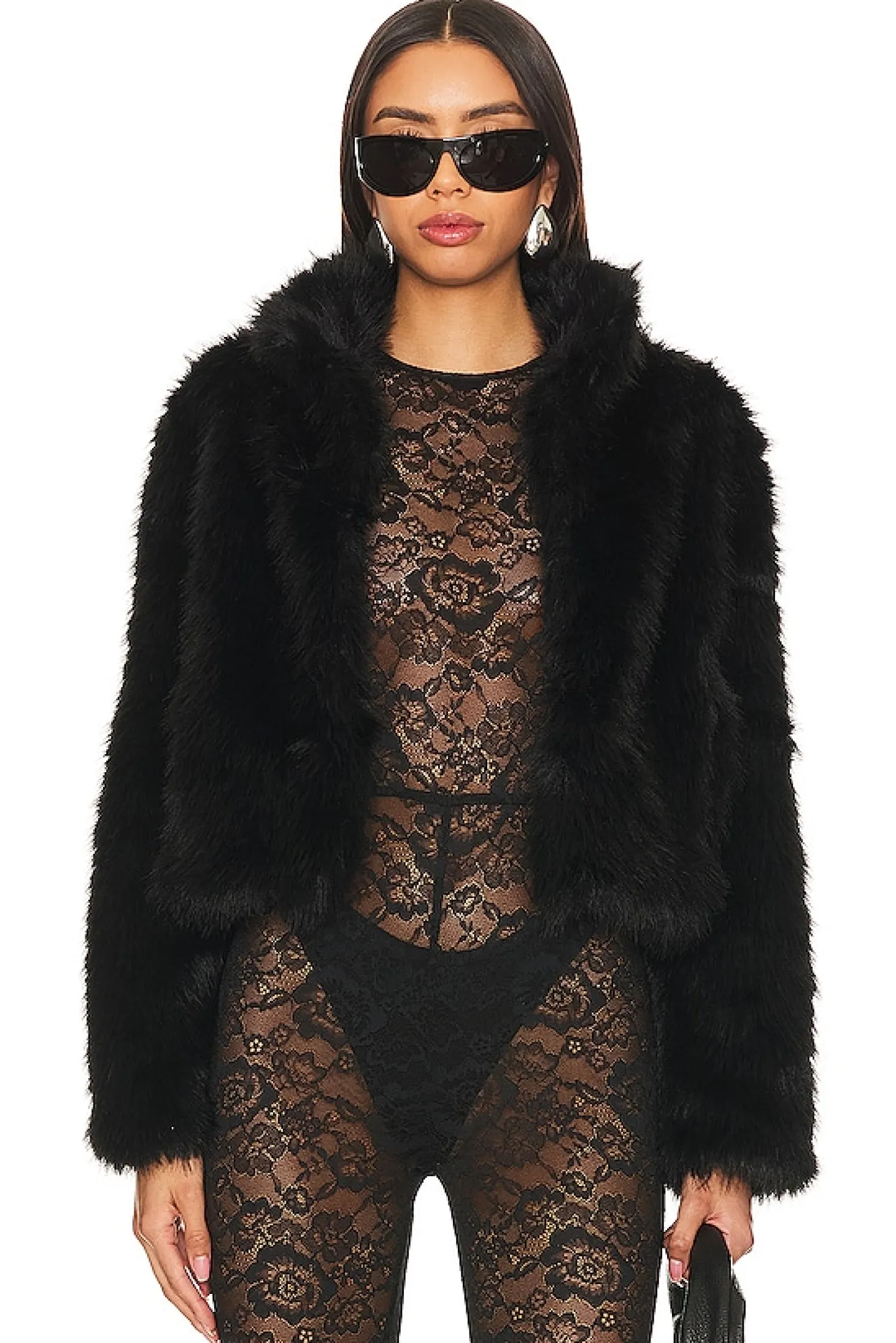 100% polyester.Made in China.Dry clean only.Singular front hook and eye closure.Side seam pockets.Lightweight faux fur fabric