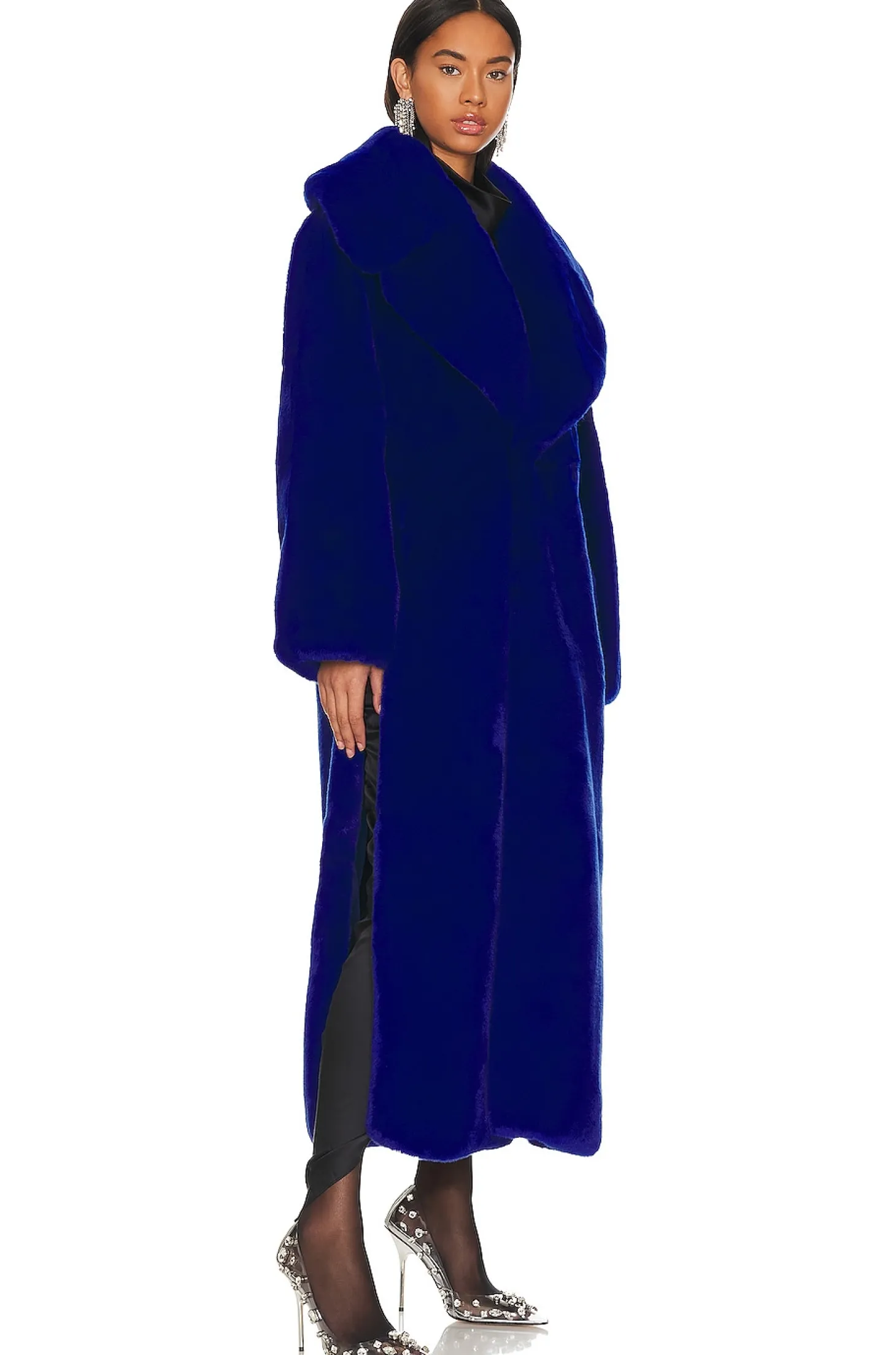 100% polyester.Made in China.Dry clean only.Front button closure.Side slant pockets.Faux fur fabric with side slits