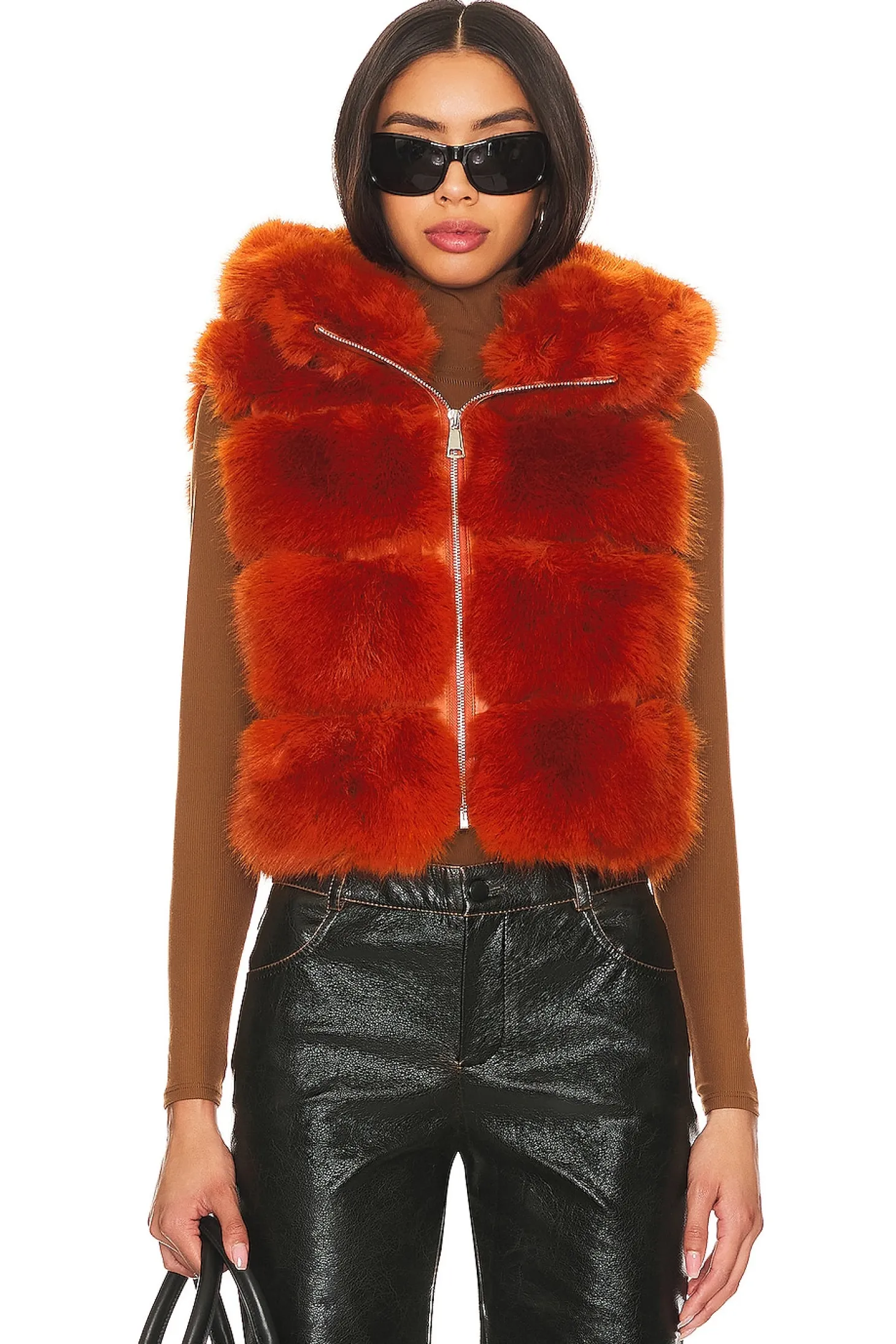 100% polyester.Made in China.Dry clean only.Front zipper closure.Side slant pockets.Soft faux fur fabric