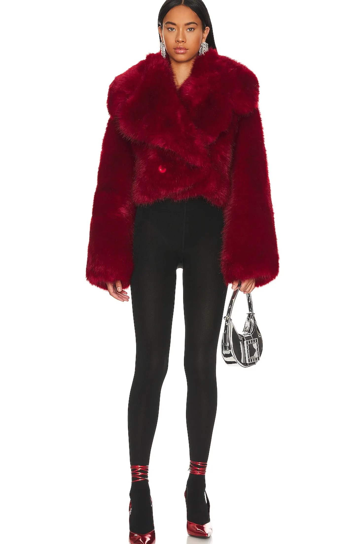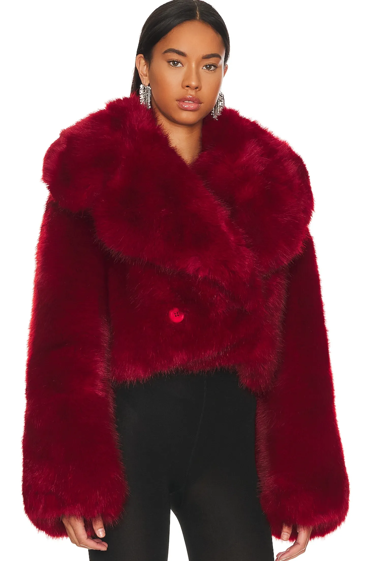 100% polyester.Made in China.Dry clean only.Front button closure.Faux fur fabric