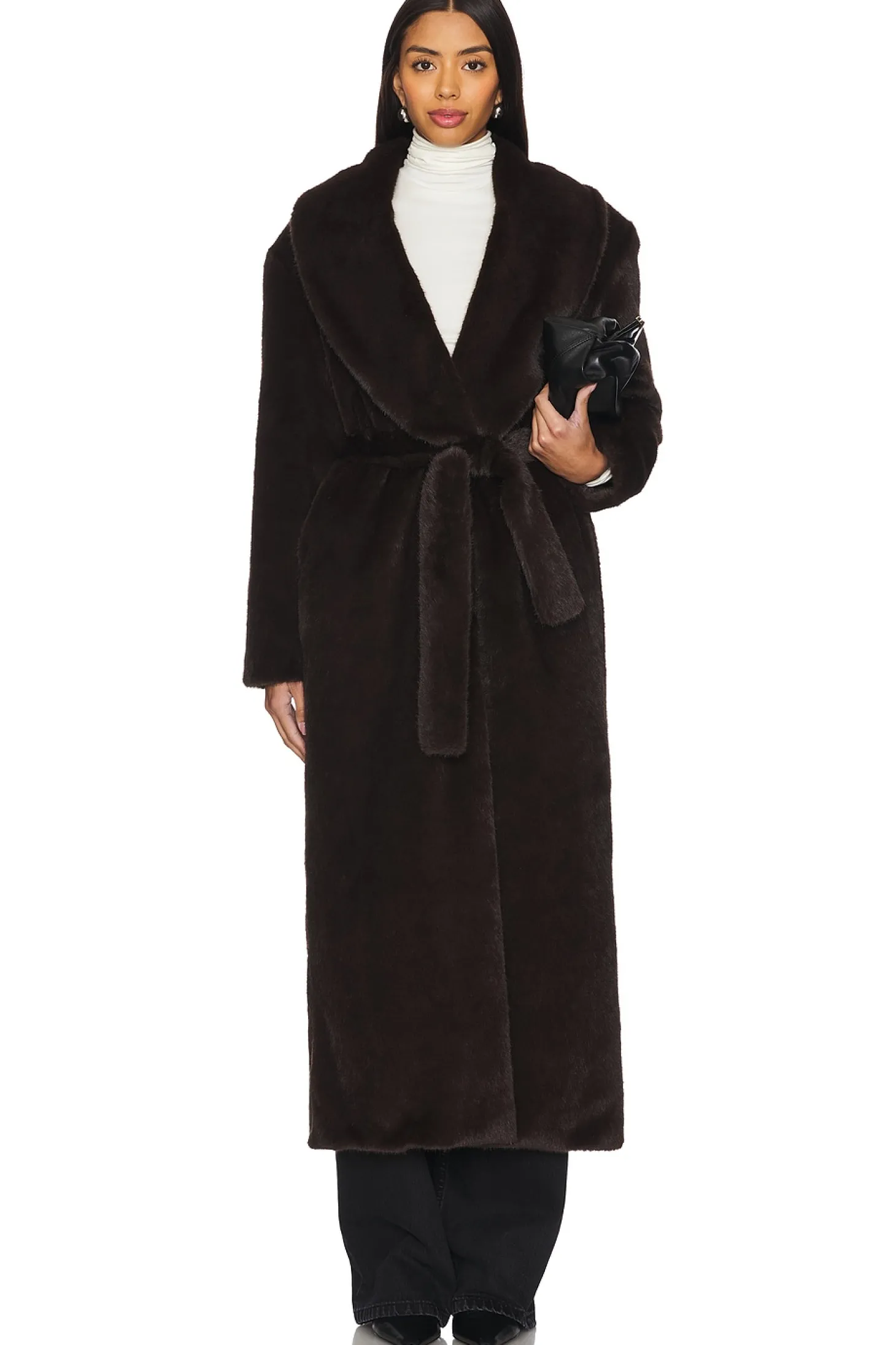 Self: 100% polyester Lining: 100% viscose.Made in China.Dry clean only.Front button closure with optional belt.Side slit pockets.Faux fur fabric