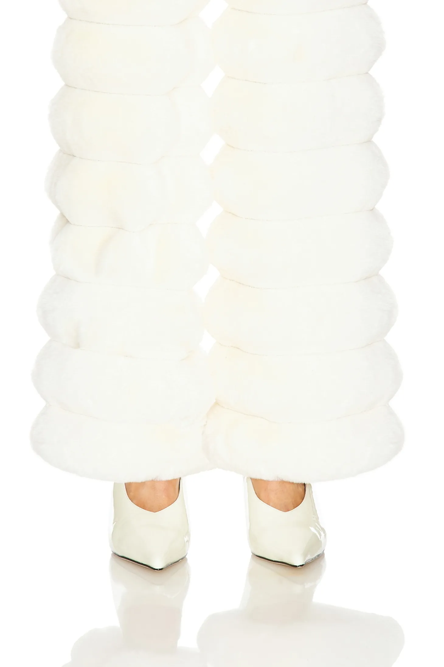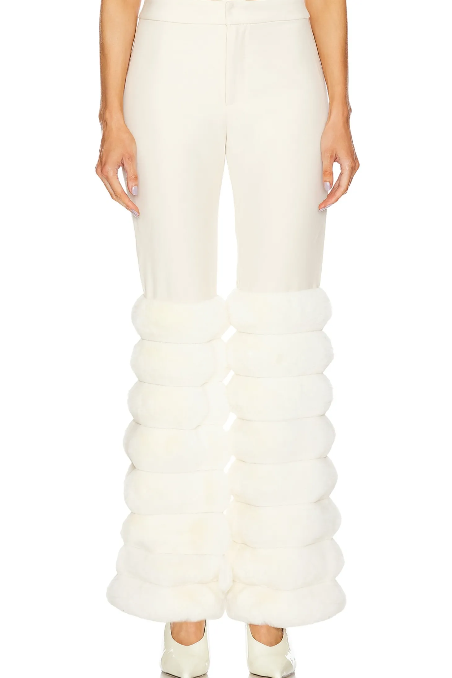 100% polyester.Made in China.Dry clean only.Zip fly with hook and bar closure.Item not sold as a set.Heavyweight faux fur fabric.16" at the knee breaks to 20" at the leg opening